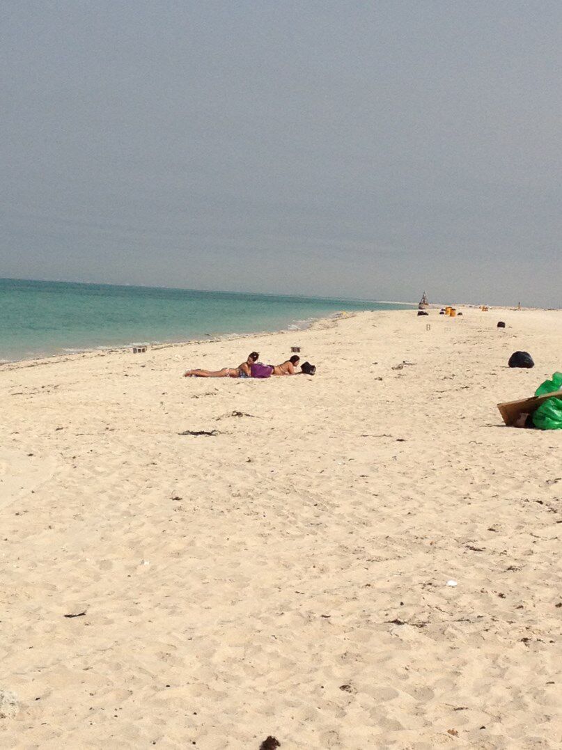 De rest van de rit verloopt vlot en vanop de snelweg nemen we de afslag naar Fuwaith, als wij de stad binnenrijden, blijkt dit niet meer te zijn dan een ruïne waar niets of niemand nog woont, zelfs de aan houd het hier voor bekeken en de rest zal weeral een off road te doen zijn, dit wordt stilaan een gewoonte. wij hebben de keuze uit links of rechts, rechts is de ruïnes in, links is de zandbak in, dus maar links gekozen, maar waar is die zee nu?. we zien een paar auto's van een piste komen, en die paar auto's moeten toch van ergens komen, dus wij die piste op, na een paar kilometer zand zien we zelfs een paar geparkeerde auto's en zelfs mensen op een duin zitten, dus de zee kan nooit veraf zijn. als wij uit de auto komen zien wij over de kop van de duin de zee, nu nog het beloofde witte zandstrand en het kan niet meer stuk, dus de zwemkledij aangetrokken en het strand op. dit strand is blijkbaar ook één van de broedplaatsen van de zeeschildpadden, waarvan het broedseizoen van April tot Juli is, maar overdag komen die niet aan land vanwege de hitte.