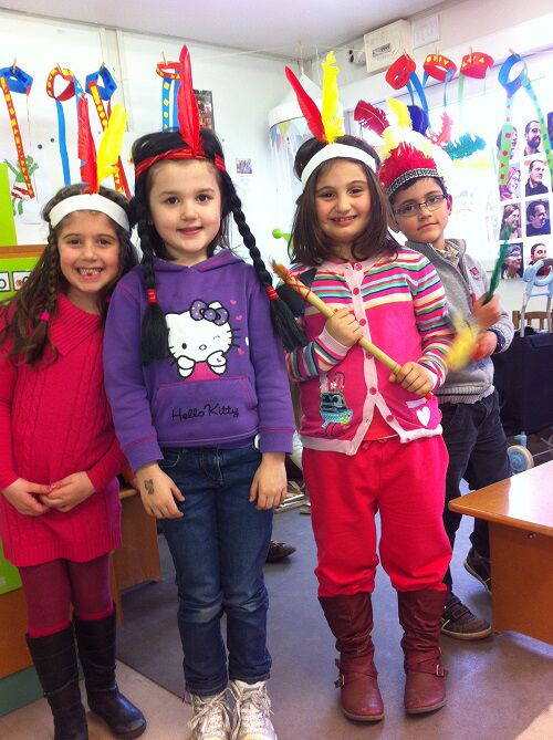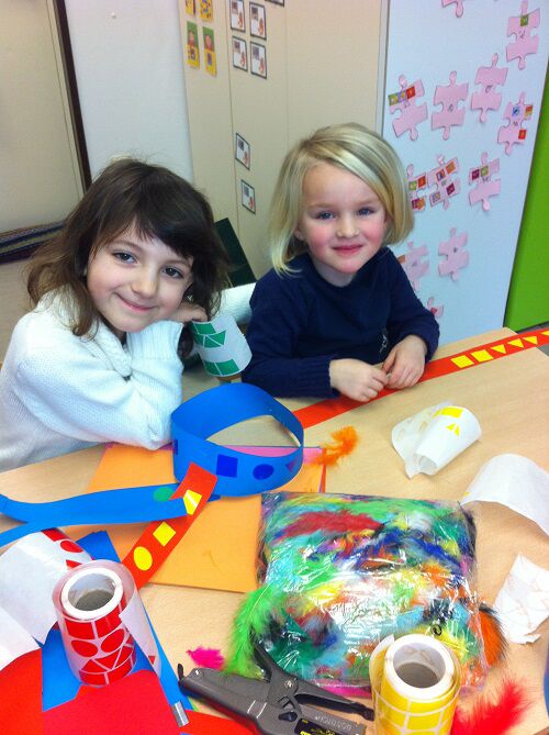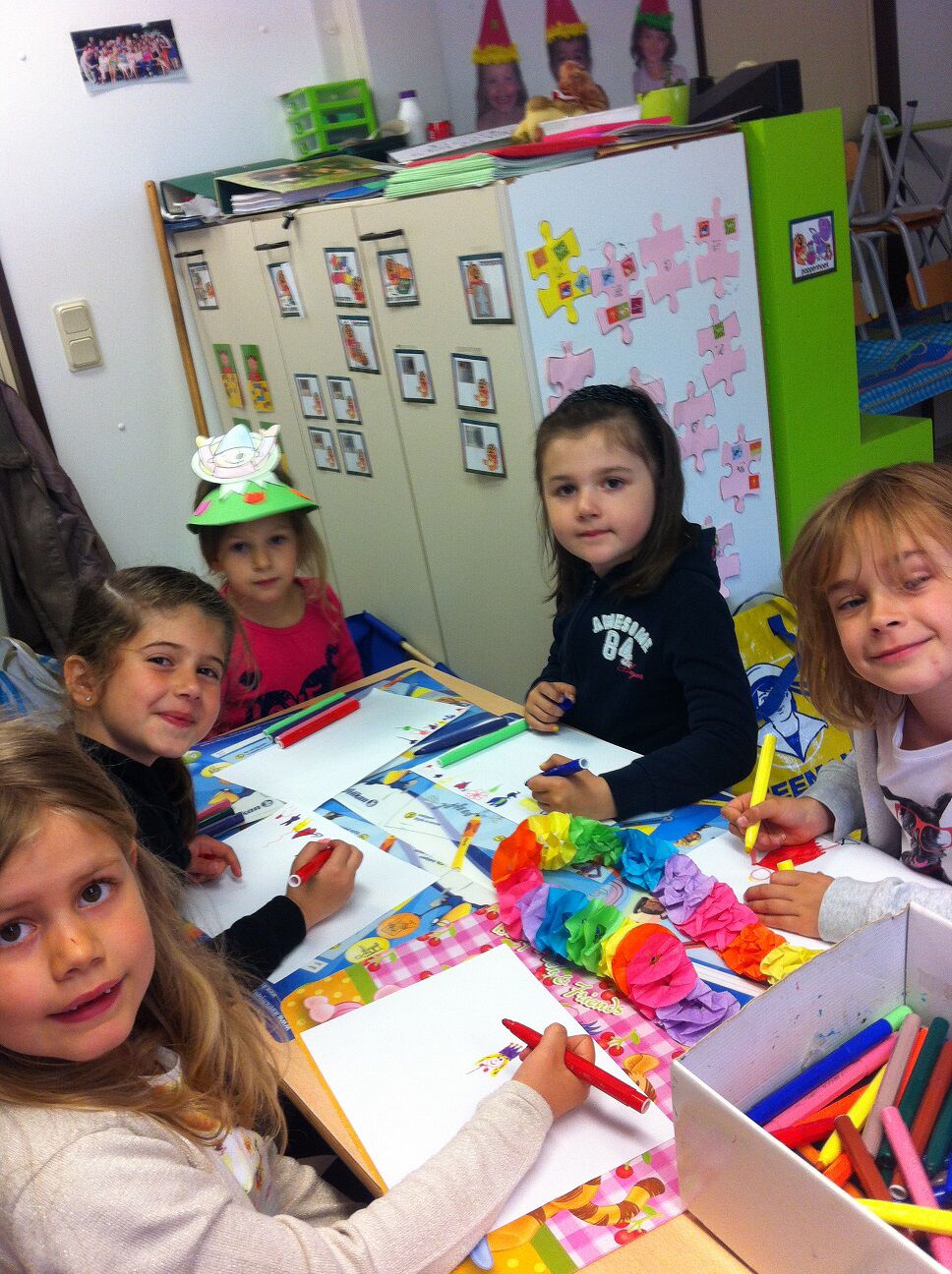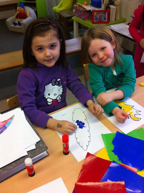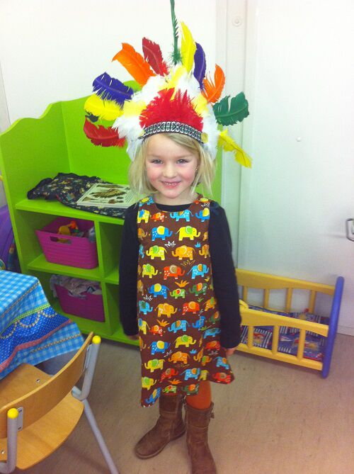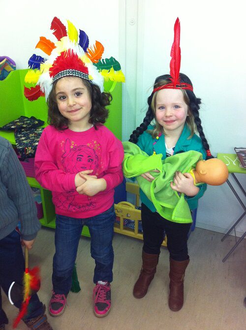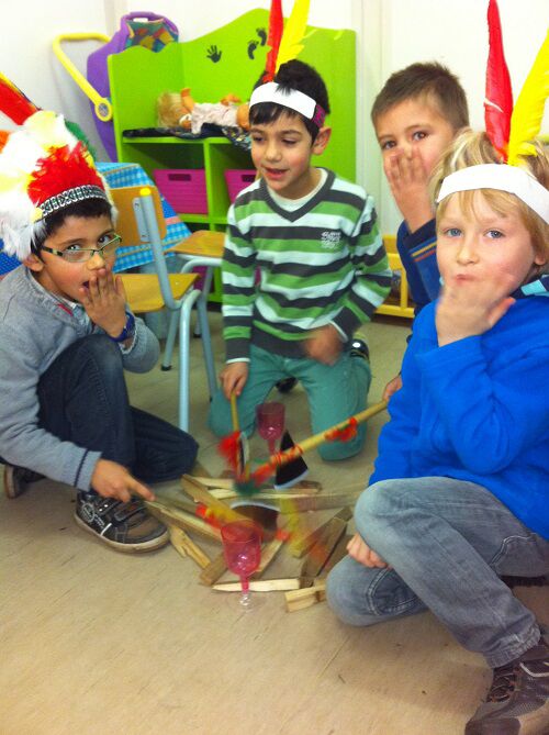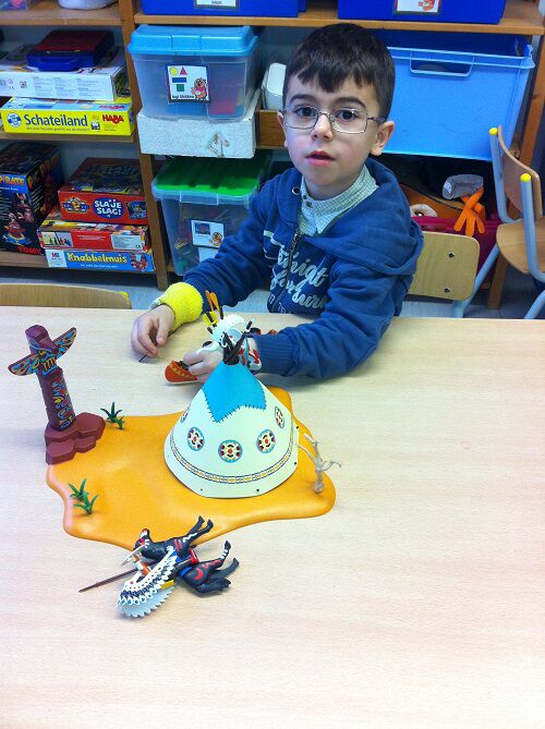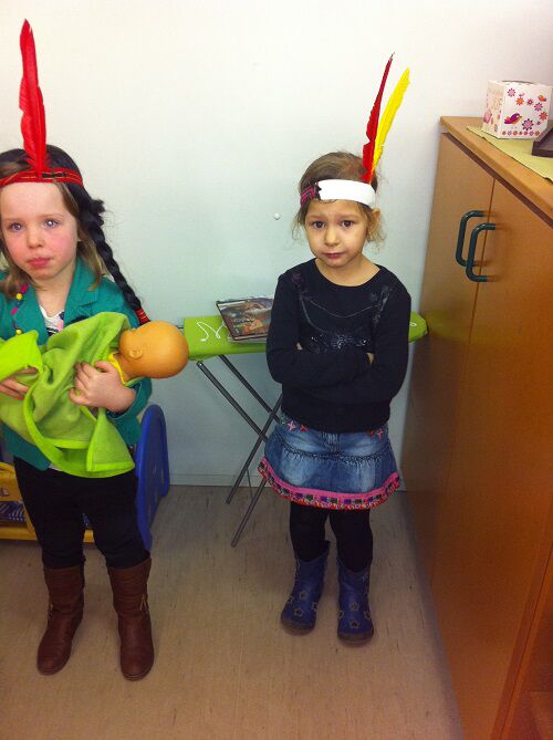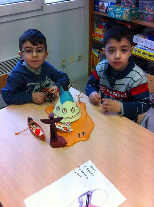 We hebben gewerkt rond het thema indianen. Wat was het eens leuk om als een echte indiaan te leven. We hadden echte indianen kleren aan, we dansten rond het kampvuur. We hebben een echte indianentooi gemaakt en konden zelf onze eigen pluimen verdienen. Wat was het leuk een echte indiaan te zijn!!!