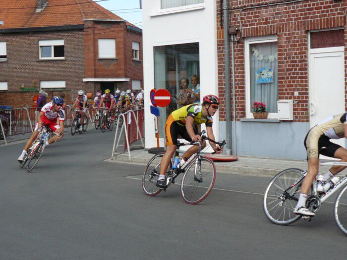 Aangezien papa met Axel naar Dottignies gaat hebben wij vervoer nodig naar Pommeroeul. Gerrit is zo lief dat hij ons wil voeren en dan na de koers ons wil naar Dottignies brengen waar het prijsverdeling is van de ronde van Dottingnies (8 koersen). We vertrekken rond 12u15 richting Pommeroeul (Aidan is vroeg afgesproken met Bram die daar ook start) Als we van de autosnelweg rijden zien we een scheve kerktoren staan... daar moeten we zijn! Aidan start om 15u en Stijn Deherder (kampioen van Henegouwen) is er ook. Ze starten met 17 renners waarvan 1 meisje. Het is een korte omloop en ze moeten 18 ronden afleggen. Ze starten en wij stappen tegen richting het parcour af om zo es foto's te kunnen trekken van de hele omloop In de zevende ronde probeert Stijn te ontsnappen maar gaat onderuit in de bocht Aidan kan hem niet ontwijken en vliegt op Stijn en gaat overkop Gerrit loopt naar hem toe en vraagt of hij gewond is.. Niks ergs en Aidan springt weer op de fiets en Gerrit duwt hem op gang.. Intussen hebben Bram en een ploegmaat van Stijn zich op kop van het peloton gezet om het tempo wat te laten zakken zodat ze eer weer kunnen bijkomen. De volgende ronde kan Aidan al weer aanpikken en de ronde daarna is Stijn er ook weer bij. In de vierde laatste ronde probeert Bram te ontsnappen maar wordt snel weer opgeslokt door het peloton. We naderen het einde en stellen ons op aan de finish. Ze komen uit de bocht en het wordt een sprint! En wat een sprint!! Aidan komt als eerste over de meet met enkele centimeters voorsprong op Stijn die tweede wordt. Na de koers horen we dat Aidan wat ingesloten zat voor de laatste bocht en dat Bram ruimte voor hem maakte zodat hij door kon Bram kon een put in de weg niet meer ontwijken en vloog bijna een halve meter in de lucht (volgens hun zeggen) Zo eindigde Bram 13e; Een hele mooie koers en jammer van die valpartij.. Op naar volgende week