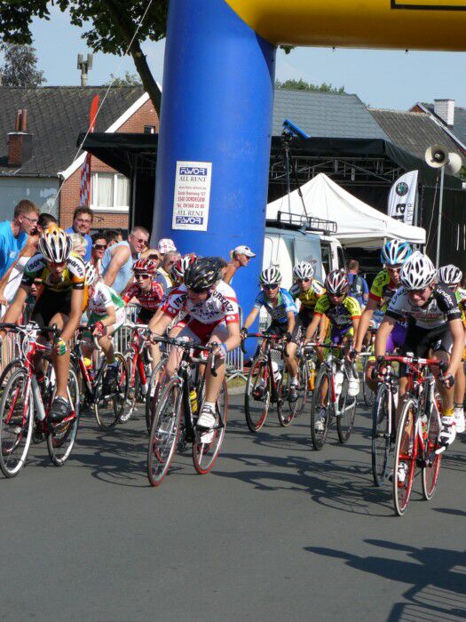 Hier was het om te doen, maar we hadden er een slechte nachtrust op zitten, om 4 u opgestaan door de warmte... Aidan kan toch een tijdje slapen in de ligzetel buiten, maar bij het ochtendgloren is iedereen klaarwakker!:roll: We vertrekken vroeg want we willen op tijd op het traject staan:-D Als we daar aankomen staat de isorextent al te blinken, juist aan de aankomstlijn:-D De sfeer zat er direkt goed in, iedereen op post en zelfs de BBQ's staan al klaar:-P We zijn daar met 28 renners en ouders van Isorex op één plaats verzameld! Dat zal nogal een feestje worden... Ze gaan eerst nog es het parcour verkennen en Aidan zegt dat het goed gaat, ondanks zn korte nachtrust:-?:roll: Om 11u21 vertrekt hij dan voor zn tijdrit... De voorgaande tijden draaien rond en boven de drie minuten vijf seconden en als Aidan aankomt roept de speaker uit dat de voorlopige besttijd verpulverd is door Aidan Neirynck!! Hij zet een tijd neer van 2min55'81" en haalt een gemiddelde van 40,9 per uur:!::!: Maar dan is er nog aankomst van Bjorn Ghijselinck en die verbetert de tijd van Aidan nog met 96 hondersten:shock: Aidan wordt dus 2e en staat op het podium, Nico Houtteman rijdt de derde tijd, ook onder de drie minuten. In de namiddag wordt er flink geluierd en gedronken, want bij dit warme weer is dat wel nodig:wink: Rond 15u zijn er dan de schiftingswedstrijden en Aidan laat zich rustig meedrijven en plaatst zich voor de finale:-) In de finale wordt er flink gekoerst en weglopen wordt geen makkie! Aidan rijdt elke ronde in de voorste gelederen en countert bijna elke aanval:-D Op de voorlaatste klim scheurt het en ze rijden met 10 man weg, alle favorieten zijn mee en Aidan is ook bij de les:wink: We maken ons op voor de eindspurt en die wordt beneden op gang geschoten, Aidan laat zich gelden en haalt alles uit de kast, en hij komt met een duidelijk verschil als eerste over de meet! Dit was er eentje om in te kaderen, goed gedaan man, je mag een jaartje met de provinciale trui rijden! Nu wat gaan rusten en trainen in de Ardennen en zo naar het Vlaams Kampioenschap!