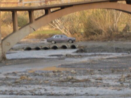 Men heeft een voorlopige weg aangelegd door de rivier. Het water wordt door buizen geleid en daarover heeft men een voorlopige weg aangelegd, over een afstand van een paar honderd meter. Het is maar een noodoplossing voor de plaatselijke bevolking, want als het gaat regenen spoelt alles weer weg. Dus op hoop van zegen, regent het de eerste maand hier niet. Auto's, taxi's en plaatselijk vrachtverkeer rijdt nu dus door de rivier van de ene kant naar de andere kant.