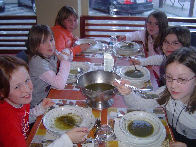 Het eerste avondeten was al geslaagd: kervelsoep werd gevolgd door lekkere appelmoes, braadworst en aardappeltjes. Als dessert konden we genieten van een chocolademousse.