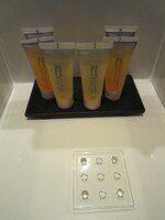 Elk onze eigen lavabo met een variatie aan verzorgingsprodukten.