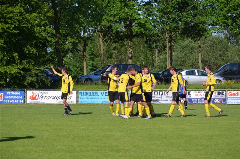 Na de uitmatch (0-3) wint N'Yzer nu ook nog de thuismatch tegen competieleider Eendracht Grammene: 2-0. Niet dat iemand er nog echt aan twijfelde: maar de 2e plaats en de promotie naar tweede is nu bijna een feit. De titel zit er wellicht niet meer in, want Grammene staat met nog 3 wedstrijden te gaan nog altijd een puntje voor. Dat laten ze echt niet meer glippen. Al weet je maar nooit met de voetbalgoden...