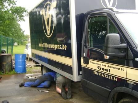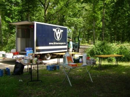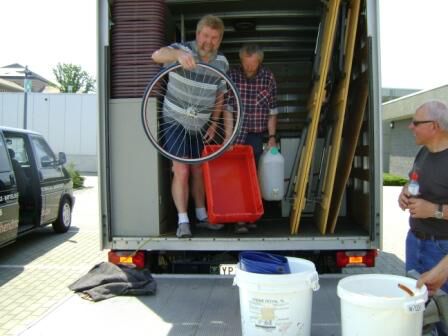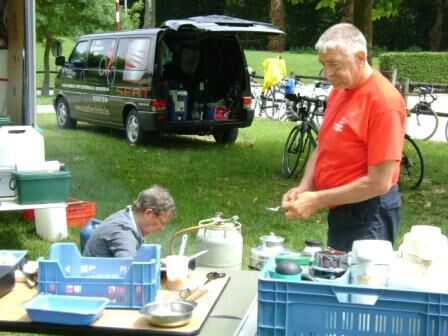 6.50 u: De eerste fietsers komen al toe. De vrachtwagen wordt ingeladen. De stoelen voor de picknick, de thermossen, en nog enkele zaken erin. Eén voor één arriveren ze nu met de auto. Hop, de fiets uit de wagen, de bagage bij Rik in de vrachtwagen en de handbagage bij Roger in de volgwagen. De partners steken een handje toe en zijn bekommerd om het wel en wee van hun fietsers.