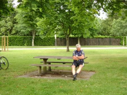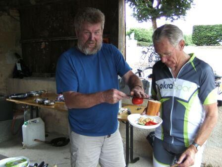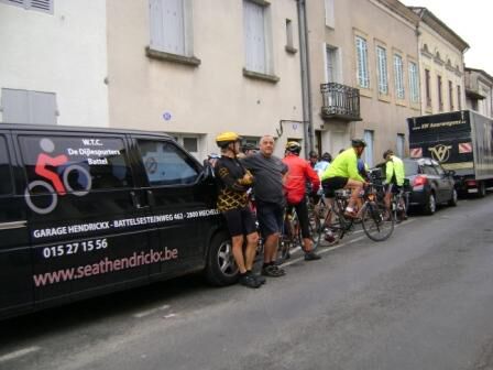 Vandaag begon de dag weer met zware bewolking. Dit duurde de hele dag afgewisseld met lichte of zware regenbuien en nu en dan eens even de zon. Twee derde van de voormiddag was er regen.Precies om 12u toen we het departement van de Dordogne binnen kwamen scheen de zon even, wat ferm deugd deed. Toch waren de weergoden met ons want op het moment dat we gingen eten scheen de zon. Vandaag had de keuken ploeg geen geluk want een plaats vinden was heel moeilijk zodat ze net terplaatse waren als de fietsers al aan kwamen. En vermits die allemaal heel grote honger hebben moesten zij zich heel erg haasten. Maar gelukkig helpen was voor hen geen probleem. Het eten had zo goed gesmaakt dat onze wegkapitein wegdommelde en er deugd van had.Na de middag nog meer buien zodat we weer moesten gaan schuilen. Maar we al droog als we in het hotel kwamen. Samenvatting : nat en koud, de zon zelden gezien maar lekke banden genoeg nl. zeven. Deze bedroeg 126 kmen gaf een hoogte verschil van 1200m. Tijdens het avondmaal eerst briefing door Willy en Karel gevolgd door het verslag van twee vorige dagen door Felix en Eric zong het liedje van : " 't is moeilijk bescheiden te blijven" waar hij het had op de prestaties van de vorige week avn de fietsers. Nog tweemaal slapen en dan bereiken we ons doel Lourdes.