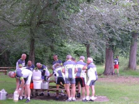 Dag drie is niet op de blog verschenen daarom dus hier het verslag van die dag. Dit was een echte baaldag. Buiten enkele bandbreuken moesten we spijtig genoeg een valpartij registreren. De plaats van ongeval was in de volle stad in 'n niet ongevaarlijke bocht, 'n klein steentje ? Dat was te Villers le Cotterets Rik was danig verschoten maar besliste toch om mee verder te rijden. Door enkelen werd hij vakkundig 'uit de wind' gezet en zo hield hij het toch 40 km. uit tot in Isles-Les-Meldeuses. En daar moest onze kranige Rik van de fiets geholpen worden. Dokter gezocht, naar een ziekenhuis gebracht door de brandweer, na drie uur wachten en eindelijk terug naar de anderen.Gelukkig had hij niets gebroken.Met de fiets zou het voorlopig niet meer gaan, dan maar met de volgwagen mee rijden. Voor de rest: drie kwart van de dag in de regen, maar toch nog 'n positieve noot. We zouden eten aan de Marne maar het regende heel de tijd. Dus gingen Rik en Dine op zoek naar een droge plaats. In de "Marie" dacht de maire heel erg na maar vond niks geschikt in zijn dorp. Hij verwees ons dan naar het volgende dorp. En ja, deze burgemeester gaf ons een feestzaal ter beschikking met alle comfort. Na al die regen was iedereen blij droog en binnen te kunnen eten. En smullen dat ze deden van de soep,de frikadellen, appelmoes en rijstpap. Met dank aan de burgemeester. De gemoedsstemming in de groep was toch wat bedrukt, De Rik niet meer bij ons liet toch wel zijn sporen na. Ik weet dat er toch enkelen stilletjes een traantje hebben weggepinkt.Onze kranige Rik had wel enkele 'daffalgannekes, gekregen voor de pijn, maar voor hem zal het zeker ook wel moeilijk zijn geweest.