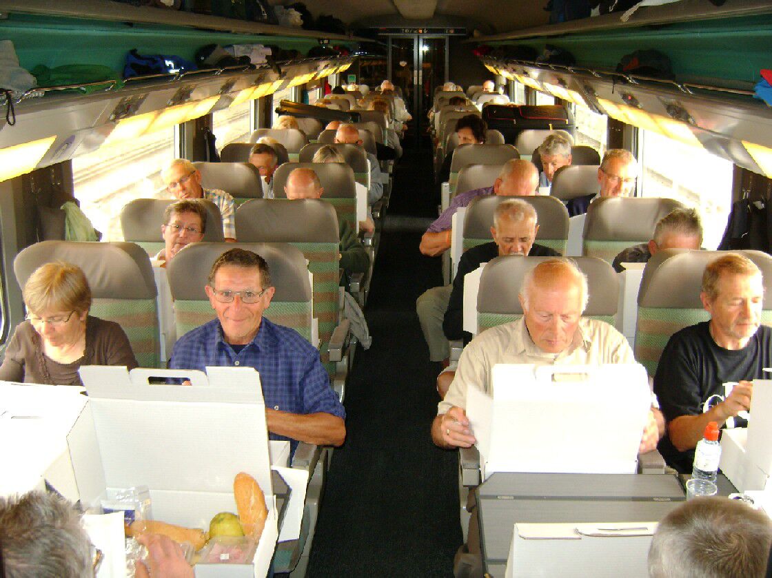 Na het laatste avondmaal van gisteren volgt, na een verkwikkende nachtrust, ons laatste ontbijt te Lourdes. Om 9u vertrok onze bus om de tweede Okra trein te halen die vertrok om 10u10. Af en toe bad men nog een een tientje en onmiddellijk na het vertrek konden we nog even een blik werpen op het Maria-heiligdom. Tussen Dax en Bordeaux kregen we een overvloedig luchpakket voorgeschoteld. Rond 16u waren we ter hoogte van Parijs. Ons eindstation Tourcoing bereikten we na ruim 7 uur sporen rond 17u30. Tussenin werd er ook de uitslag van een kwis gegeven. De regio Kempen en Turnhout bekwamen de beste resultaten. En van onze 23 fietsers is er ook één in de prijzen gevallen: Jan kreeg wat pleisters en een rol WC papier waarop stond : prijs van de meeste platte banden ( 10 ? ). Zeg maar de prijs van de grootste pechvogel. Hij kon er mee lachen en zong het liedje "el banditos". Om 18u stonden de bussen ons op te wachten en de eersten waren vanaf 20u al op hun afstapplaats. Wat leerde we uit deze tocht ? Hoe meer zuiderlijker we reden hoe slechter het weer werd en hoe meer regen we te verwerken kregen. Vooral in Lourdes was het koud en regende het veel. De deelnemers kwamen uit verschillende regio's zowal uit het uiterste oosten als het uitterste westen en toch vormden we een hecht team. Vooral de dag dat Rik gerepatrieerd werd naar Hasselt voelden we dat met zijn allen zeer goed aan. Ook de soms slechte weersomstandigheden konden daar niks aan veranderen, integendeel zelfs. Het redactie team vond het een hele uitdaging om deze blog te verwezelijken in soms moeilijke omstandigheden (vb. verslag schrijven op de rand van het bad omdat dat de enige plaats was waar we voldoende licht hadden ) Vaak waren er ook problemen in sommige hotels om op internet te geraken. Het team bestond uit twee deelnemers die nog nooit een blog hadden aangemaakt. Een snelcursus bij Okra Mechelen en veel geduld brachten dit resultaat. Bedankt aan de meer dan 3000 lezers en uw reacties. We hopen met zijn allen dat we innerlijk sterker geworden zijn door deze fietstocht en bedevaart naar Lourdes.