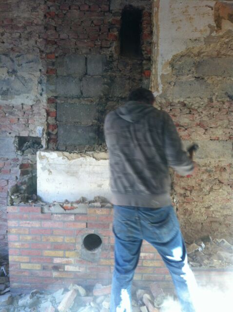 Vandaag zijn Annick (vriendin van Shana) en Luc (vader van Annick) komen helpen. We zijn boven gaan afbreken. Luc is begonnen met de schouw af te breken in de badkamer. Omdat we niet goed weten hoe de schachten in het huis lopen, heeft Luc eerst de bovenkant opengebroken om te kijken. Bleek dat er 3 'kokers' door lopen. We wisten eigenlijk niet wat te doen... Annick heeft toen haar 'nonkel Eddy' gebeld, die vroeger in een bouwbedrijf heeft gewerkt. Na wat te hebben rondgekeken en hier en daar een kijkgat te hebben gemaakt, is het verdict gevallen. Als we de schouw in de badkamer willen afbreken moeten we boven aan beginnen (lees op het dak beginnen) = neemt veel tijd en geld in beslag. We hebben er ondertussen over zitten nadenken en zoals Luc ook al in gedachten had gaan we dus de schouw laten staan en dat gebruiken om de leidingen, elektriciteit laten doorlopen. Nu moeten we onze badkamer verdeling misschien terug herbekijken. Maar goed, met verbouwingen moet je keuzes maken, he. De schouw in de living was een ander verhaal. Door de fietsengang steunt deze schouw niet op de volgende, dus afbreken was die handel. Vooral Luc en Eddy hebben zich er opgestort. In nog geen 2 uur was de zaak gefixed. Ik moet zeggen, nu de schouw weg is lijkt de ruimte enorm groot.