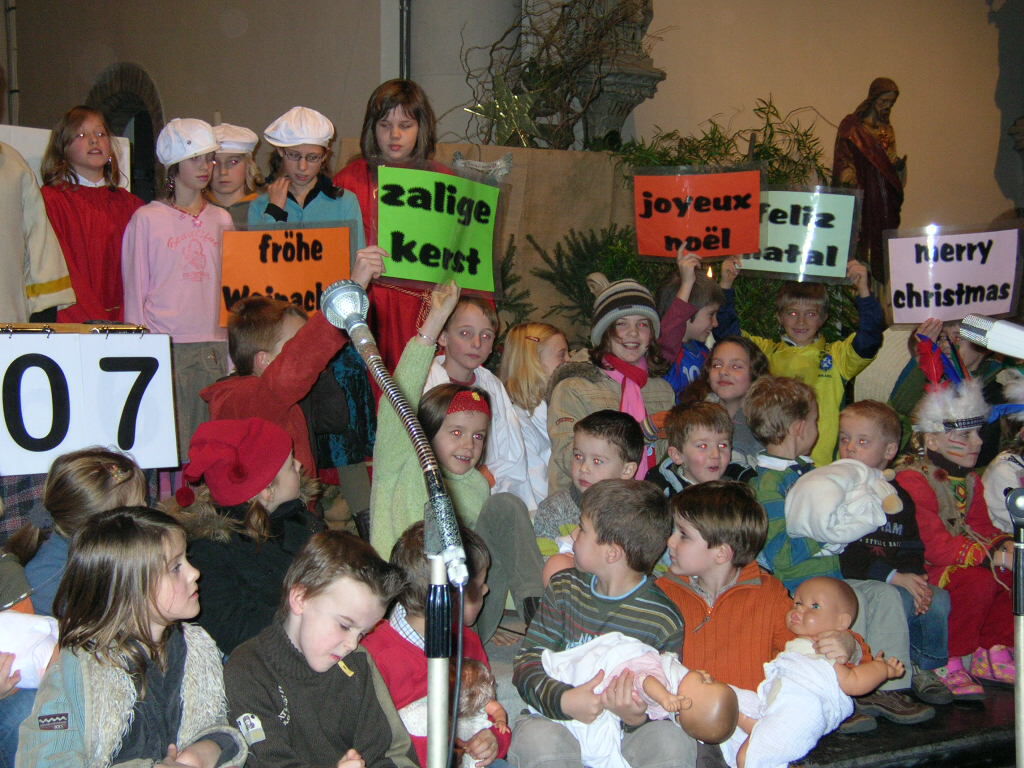 24 december omstreeks kwart voor zes was het werkelijk een drukte van belang daar in de kerk. Een heleboel volk trok naar de kerstavondviering. Er werden tweehonderd boekjes gedrukt (honderd voor volwassenen en honderd voor kinderen) en al van vijf voor zes waren alle boekjes uitgedeeld. De laatste mensen moesten het zonder boekje stellen... Het thema van deze kerstviering was 'jij telt mee'. Het begon met de volkstellers die niet 2004 mensen geteld hadden. Net als de telling afgesloten was, kwamen Maria en Jozef nog binnen. Gelukkig konden zij de stad nog binnen ondanks het feit dat de telling al afgesloten was. Er was nog een plaatsje in een stal waar Jezus geboren werd. Daar kwamen ook een heleboel vriendjes die hielpen bij het wiegen van het kindje en de herders kwamen ook nog op bezoek. Uiteindelijk kwamen ook een hele stoet van buitenlanders op bezoek, die ons allemaal een "VROLIJK KERSTFEEST" wensten, elk in hun eigen taal...