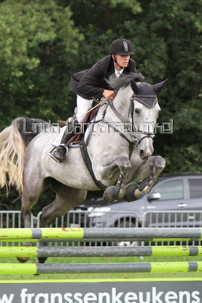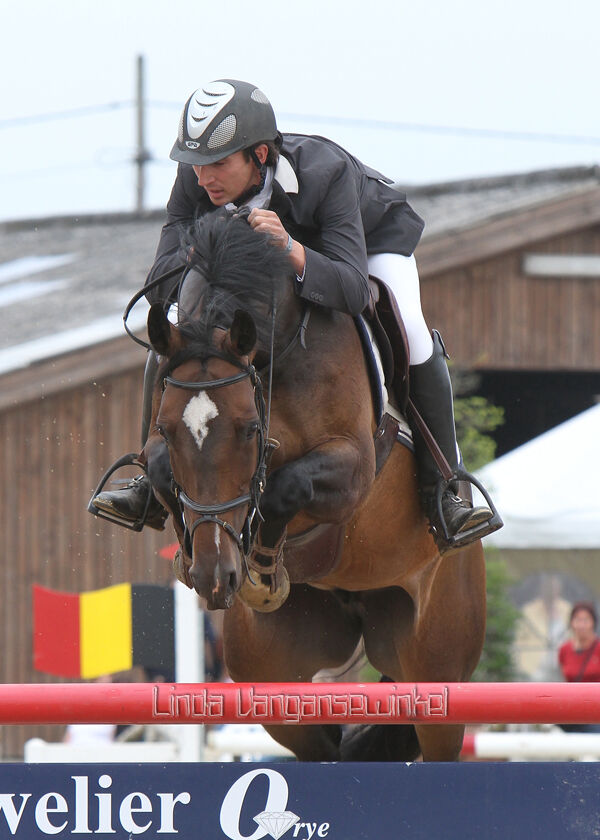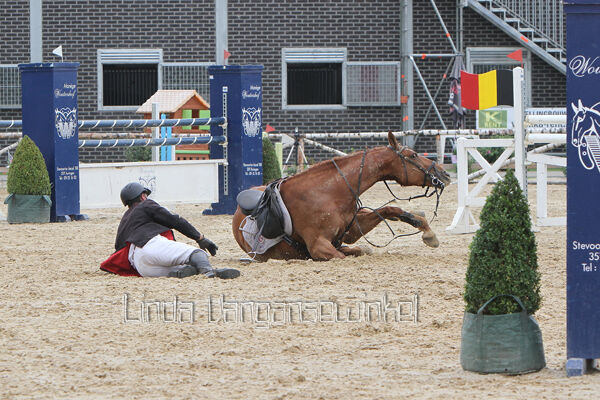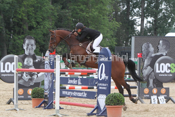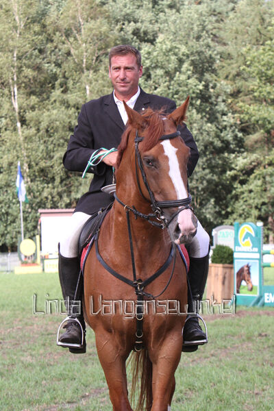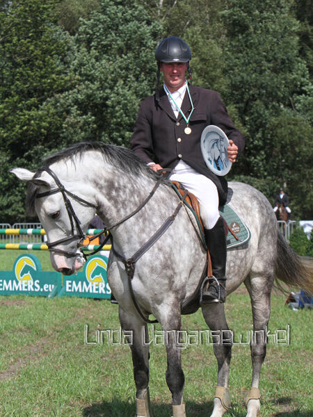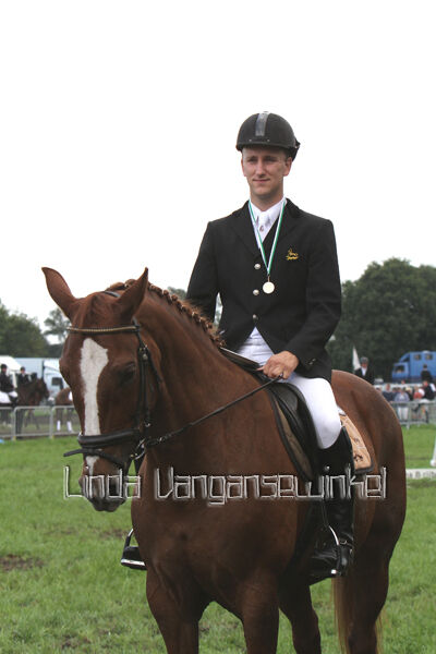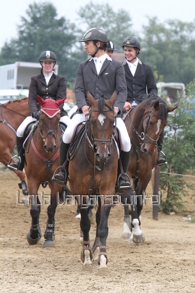 Klasse Zwaar ... die deelnemers kregen een stevige regenbui te slikken. Anders hadden er heel wat meer ruiters de barrage bereikt. Amper drie slaagden erin. Joris Schepers vier strafpunten, daarna Tessa Aerts die er acht kreeg. Als laatste Joris Aegten ... gewoon foutloos blijven stond hem te doen om de titel te pakken. Trager dan zijn voorgangers, maar Joris bleef wel foutloos! Kletsnat geregend mocht Joris de schotel afhalen. Ook kreeg hij de "gulden sporen" omgegespt. Die mag hij houden tot er volgend jaar weer een nieuwe kampioen is.