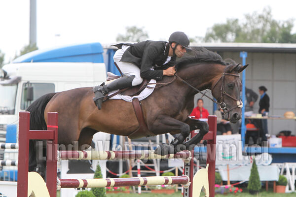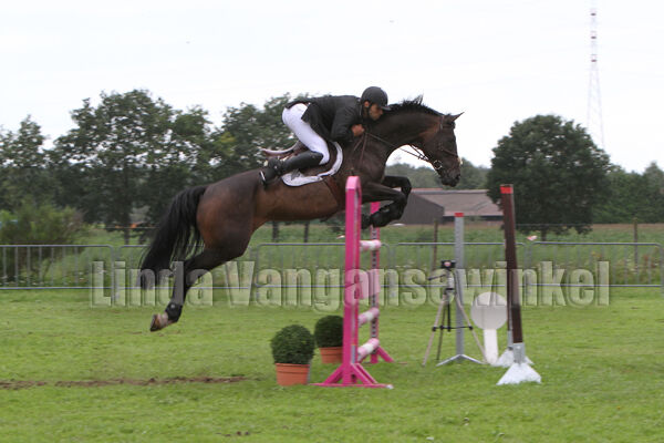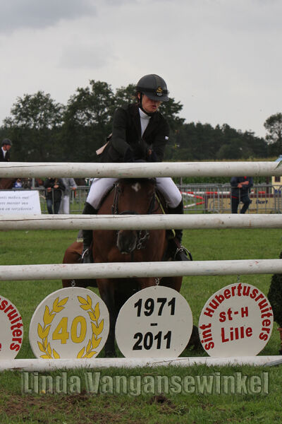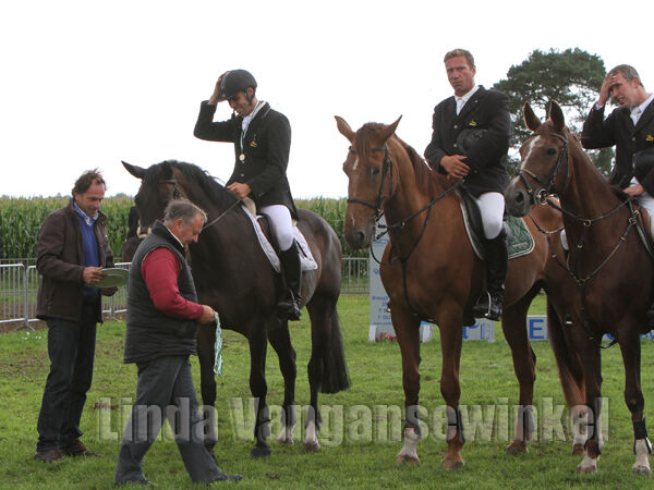 Klasse Zwaar ... die deelnemers kregen een stevige regenbui te slikken. Anders hadden er heel wat meer ruiters de barrage bereikt. Amper drie slaagden erin. Joris Schepers vier strafpunten, daarna Tessa Aerts die er acht kreeg. Als laatste Joris Aegten ... gewoon foutloos blijven stond hem te doen om de titel te pakken. Trager dan zijn voorgangers, maar Joris bleef wel foutloos! Kletsnat geregend mocht Joris de schotel afhalen. Ook kreeg hij de "gulden sporen" omgegespt. Die mag hij houden tot er volgend jaar weer een nieuwe kampioen is.