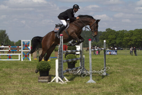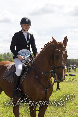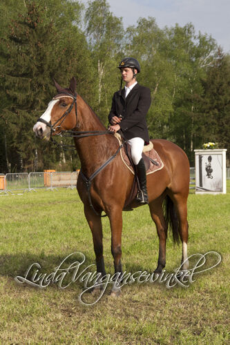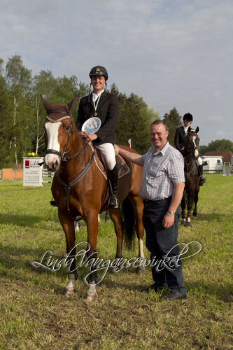 Negen deelnemers, sommigen vielen te vroeg uit. Met ne man of 5 waren ze toch wel mekaar waard: Peter Thomas, Kelly Vanhoudt, Louke Baeten, Katrien Hulsbosch en Giel Theuwis. Ze gingen gelijk op, terwijl het parcours bangelijke hoogten begon aan te nemen. In de laatste ronde waarbij de laatste 1.60 m lag .... (eenmeterzestig!!!) ging het nog tussen Peter, Kelly, Katrien en Giel. Potverdikke da was spannend. Peter ne balk, Katrien een volte, Kelly ne balk. Dan was het aan ons Gieleke. En Luca, ze deed wat er werd gehoopt. Een meter zestig asteblief. De eerste prijs, een hindernis met vier balken was binnen. Onderleggers hadden we al gewonnen, dekens ook al verschillende en champagne ook al ooit gehad. Maar een hindernis, da is nogal wa anders zou ik zeggen.