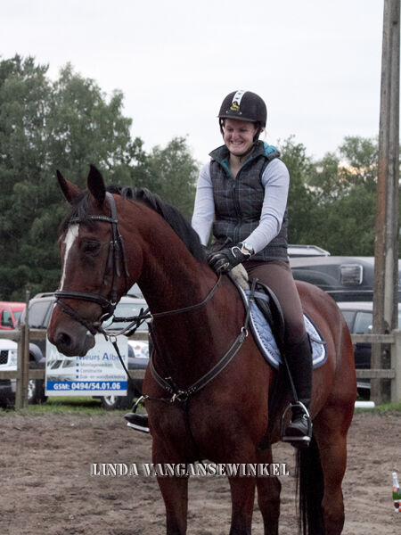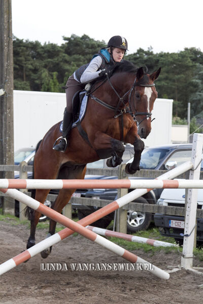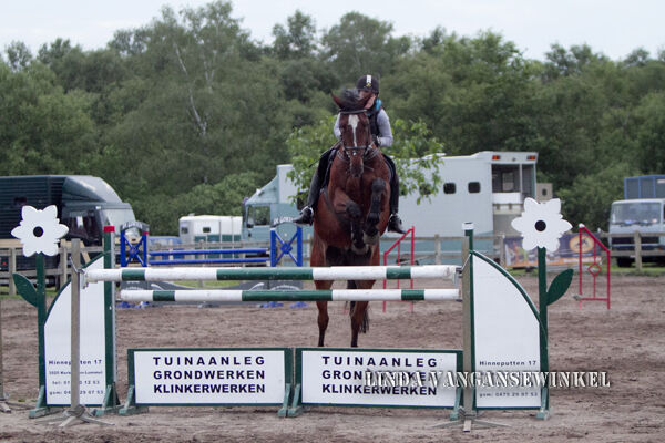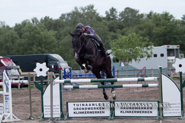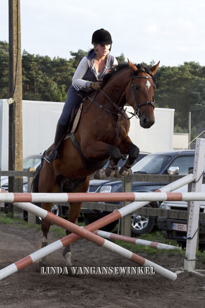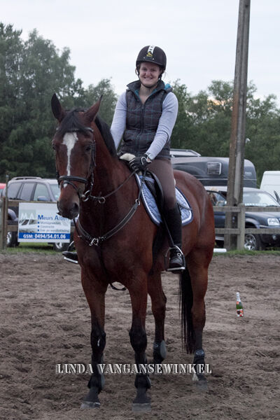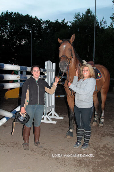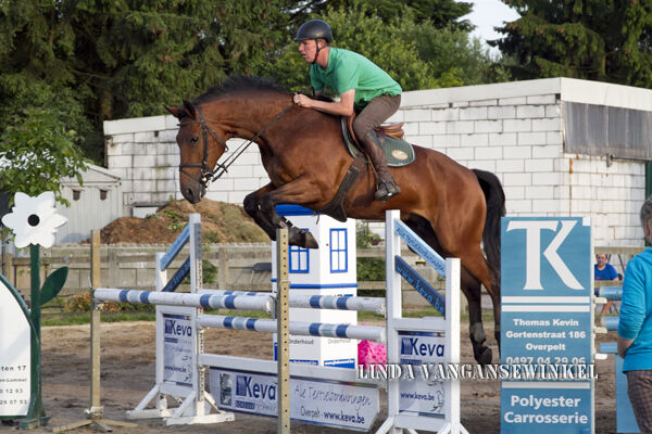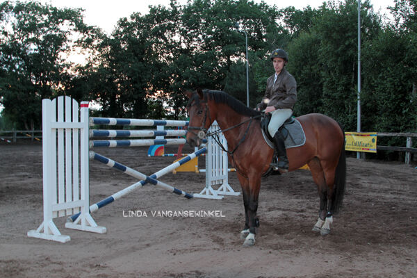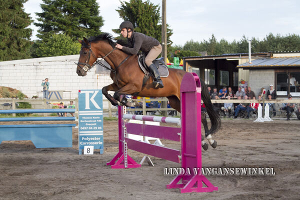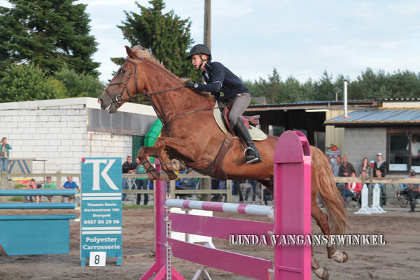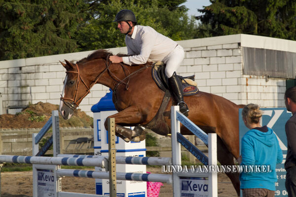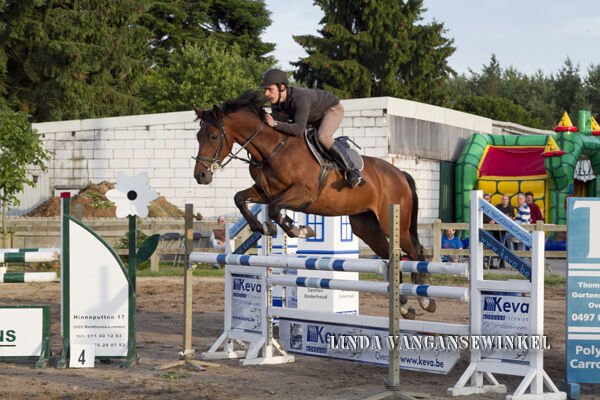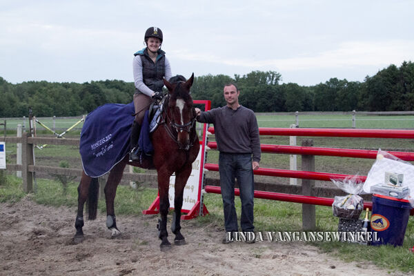 Negen deelnemers, sommigen vielen te vroeg uit. Met ne man of 5 waren ze toch wel mekaar waard: Peter Thomas, Kelly Vanhoudt, Louke Baeten, Katrien Hulsbosch en Giel Theuwis. Ze gingen gelijk op, terwijl het parcours bangelijke hoogten begon aan te nemen. In de laatste ronde waarbij de laatste 1.60 m lag .... (eenmeterzestig!!!) ging het nog tussen Peter, Kelly, Katrien en Giel. Potverdikke da was spannend. Peter ne balk, Katrien een volte, Kelly ne balk. Dan was het aan ons Gieleke. En Luca, ze deed wat er werd gehoopt. Een meter zestig asteblief. De eerste prijs, een hindernis met vier balken was binnen. Onderleggers hadden we al gewonnen, dekens ook al verschillende en champagne ook al ooit gehad. Maar een hindernis, da is nogal wa anders zou ik zeggen.