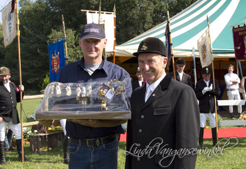 Na een geslaagd ponytornooi kunnen we ook tevreden terugblikken op Provinciaal Ruitertornooi 2012, bij ons hier in Overpelt. Alle ingrediënten voor het slagen hadden we aan onze kant. Als je dan reacties hoort van " een Provinciaal tornooi met Nationale allures", amai dat doet deugd voor ons als inrichter. In de eerste plaats het weer kon niet beter, een talrijk publiek, de sfeer zat helemaal goed en tenslotte spannende wedstrijden bij tijden om de nagels bij stuk te bijten. Nogal wat van de favorieten konden hun niveau van de voorbije wedstrijden aanhouden en zo de titel binnenrijven. Voor ons was er naast de spanning van het inrichten nog een hoogtepunt wat zeker eens mag vermeld. In elke vereniging heb je steunpilaren, trekpaarden kan je ze ook noemen. Awel bij ons hebben we ook zo een die dit jaar een speciale vermelding verdiend. Gerard Janssen, sinds jaren begeesterd commandant van achttal M trakteerde bij het begin van dit werkjaar al voor zijn vijftigste (!) jaar lidmaatschap bij LRV Overpelt. Hoe kan je zo iemand beter huldigen en bedanken voor zovele jaren inzet dan op het Provinciale tornooi op eigen terrein! Bij aanvang van de middagparade werd hij nietsvermoedend even naar voren geroepen. Na een dankwoord werd hem het gouden LRV insigne opgespeld en ook een keramisch aandenken van de hand van een of andere Overpeltse overhandigd. Na Gerard zijn moment van glorie werd de uitslag van de overkamping groepsdressuur bekend gemaakt. RV St Trudo Peer met commandant Jean Symons vooraan, dat heel de zomer al sterk presteerde mocht naar voren treden om de wisselstandaard en negen erelinten te ontvangen. Meldert en Bocholt volgden in de overkamping. In dressuur Z2 kon de favoriete Kirsten Vermeire bevestigen. De andere deelnemer in de overkamping was Pieter Foets². Het zilver kreeg hij met Reo vh Wohlfarthof en brons met Excellance. In Z1 was het goud voor Pieter en Gentleman voor Evi Steyvers² met Gokker en Focus. In de springklasse Midden was Agneta Cleuren de ster. Met Flash de Kalesh reed ze de snelste foutloze barrage. Dit lag in de verwachtingen, maar je moet het dan toch maar doen. In Klasse Z steeg de spanning tot een hoogtepunt. Met 33 combinaties en 11 hiervan uit overpelt, mochten er 17 verder naar ronde 2. Drie ruiters mochten verder naar de beslissende barrage. Liesbeth Postelmans mocht de barrage als eerste testen. De vreugde van het foutloze parcours duurde niet lang, ze had immers 2 tijdfouten op de teller. Dan was het de beurt aan plaatselijke ruiter Peter Pinxten. Het zou toch mooi zijn ... Hij pakte in de rapte de laatste balk mee. Koen Geerits die met zijn vijfvoudig winnaar Ulien een ronde eerder uitgeschakeld was mocht nog zijn kans wagen met Duchesse, een paard van schoonvader Edgaar Thijs. Deze man moet supergelukkig geweest zijn na de foutloze barrage van Koen en zijn Heureka de la Loge afstammeling Duchesse. Goud, de gulden spoor, een daverend applaus en een ereronde voor het uitzinnige publiek voor Koen! Tornooiweekend Overpelt is geslaagd. Dubbel en dik geslaagd.