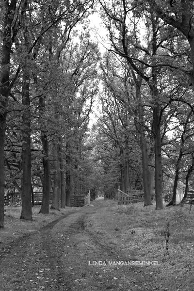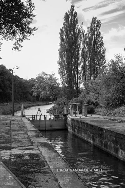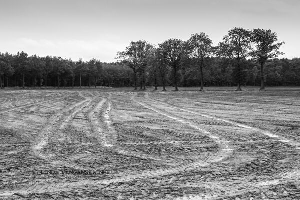 Sluis aan de blauwe kei. Zwart/Wit landschap. Het hobos en een akker van boer Theuwis