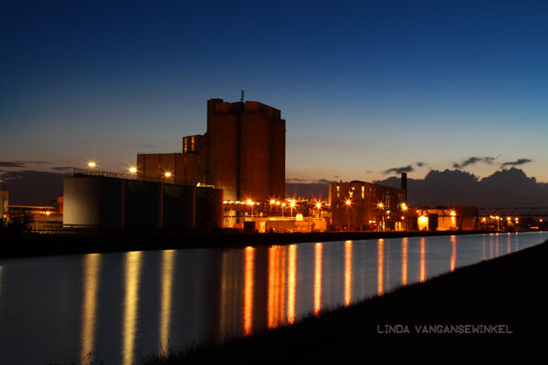 Industrieel landschap bij schemering, Pelt Fabriek. En de adelberg in valavond.