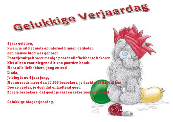 Vandaag is paardjesuitpelt jarig. Vier jaar geleden stuurde ik deze blog de wereld in. En ik ben oprecht blij met mijn 60.000 bezoekers. De laatste dagen waren heel spannend merci vrienden en supporters dankzij wie het wel gelukt is. We hebben de kaap van 60.000 op tijd gehaald. Gisteren kreeg ik op de oefening al 3 klinkende zoenen, 'k had de reden eerst nog niet door. En vandaag zoooo een schoon kaartje in de box dat ik jullie niet kan/wil onthouden.