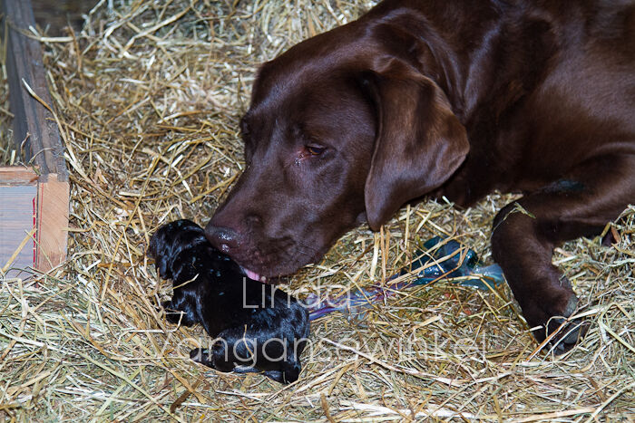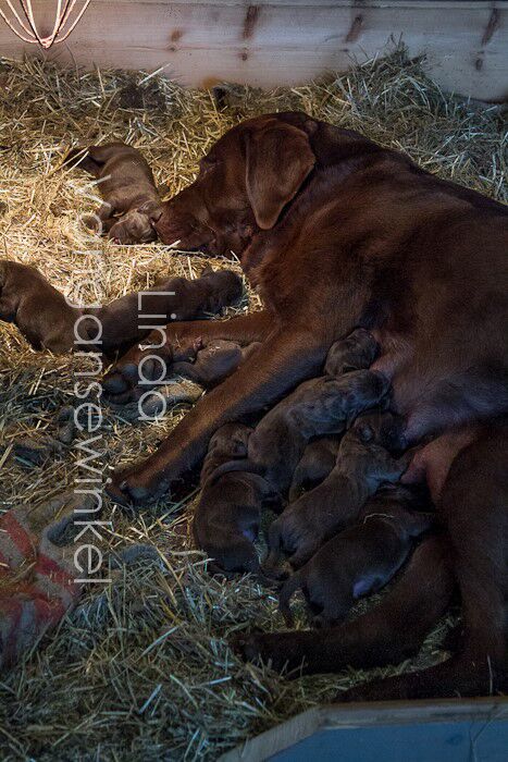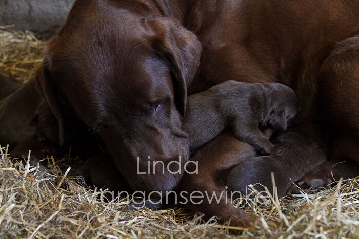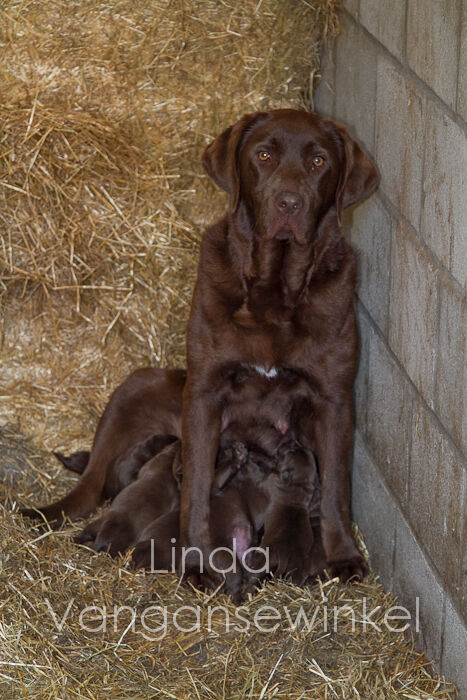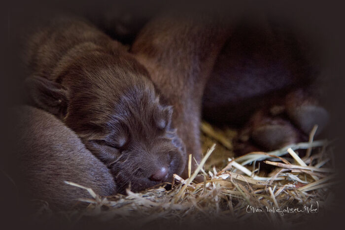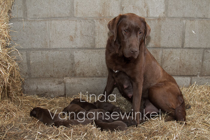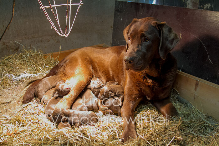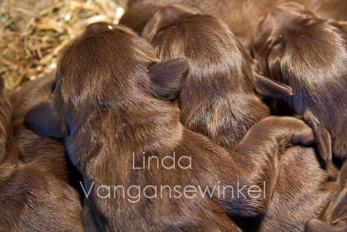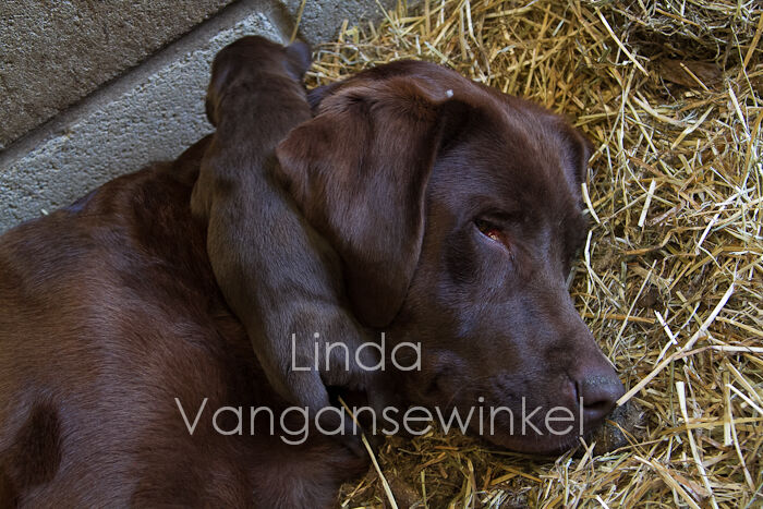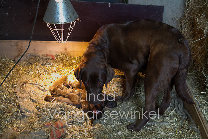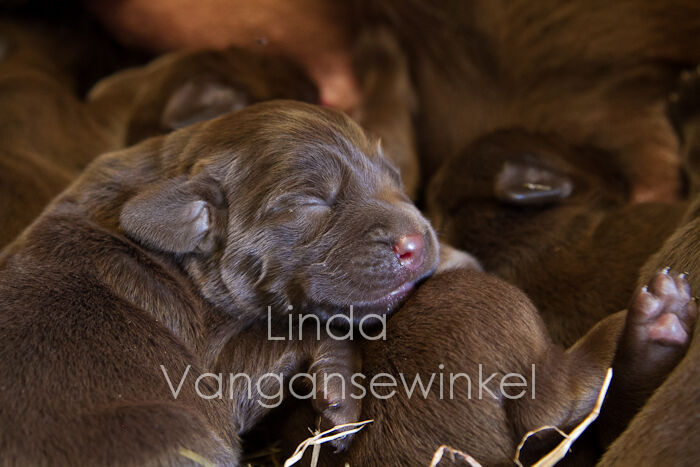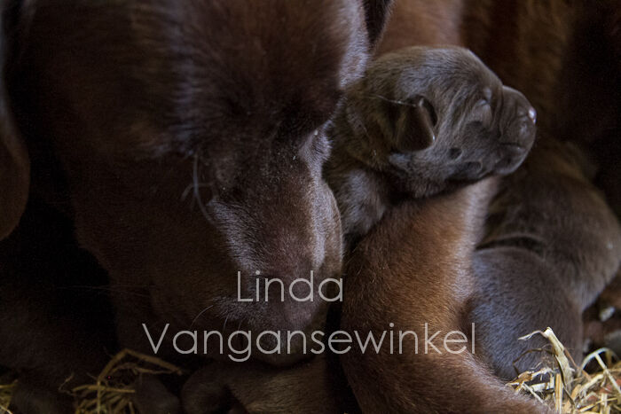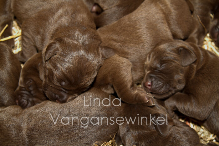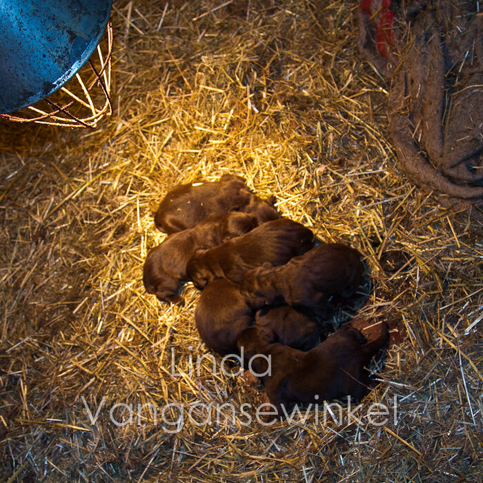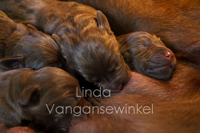 Gisterenavond om 21.20 kwam de eerste piepen en deze morgen om half 7 numero 9. Laat ons asteblief hopen dat dat de laatste is, want ik vind maar negen tepels. Negen doggy's, vijf jongskes en vier meisjes. En allemaal waarop we hoopten, schoon bruin.