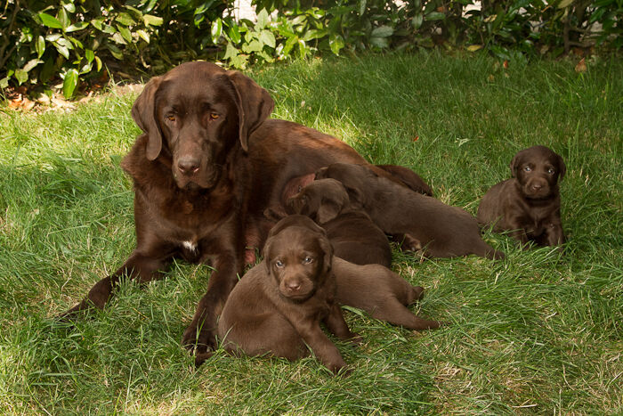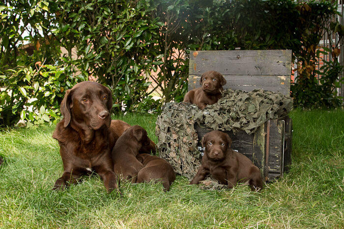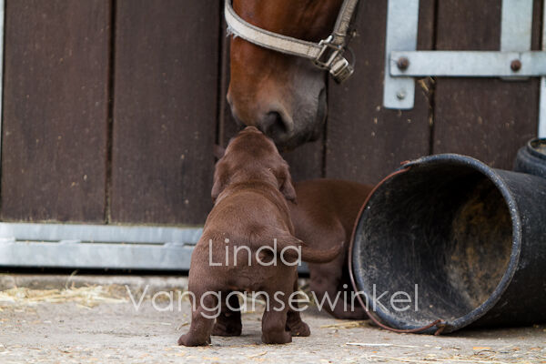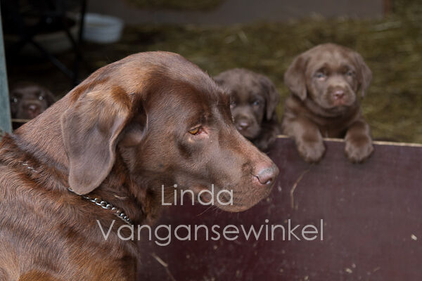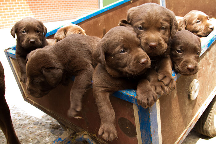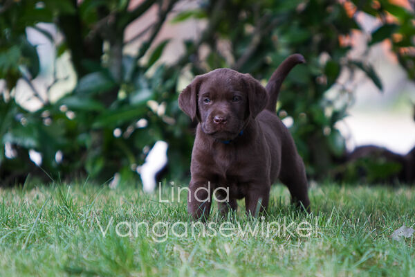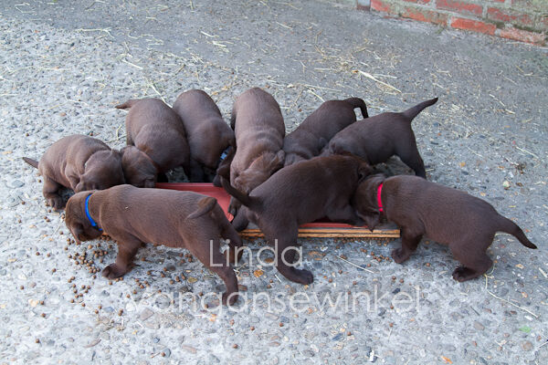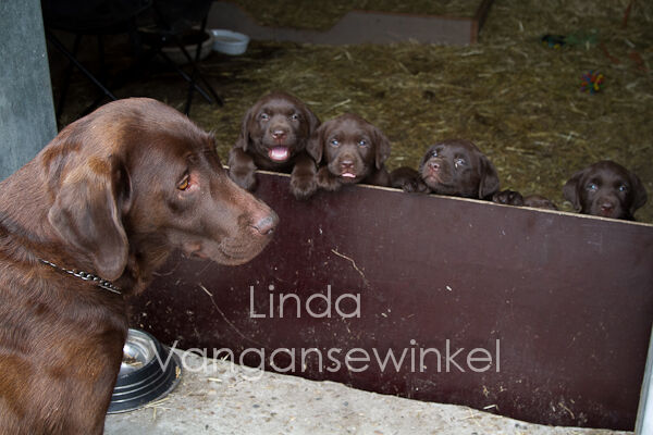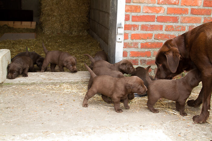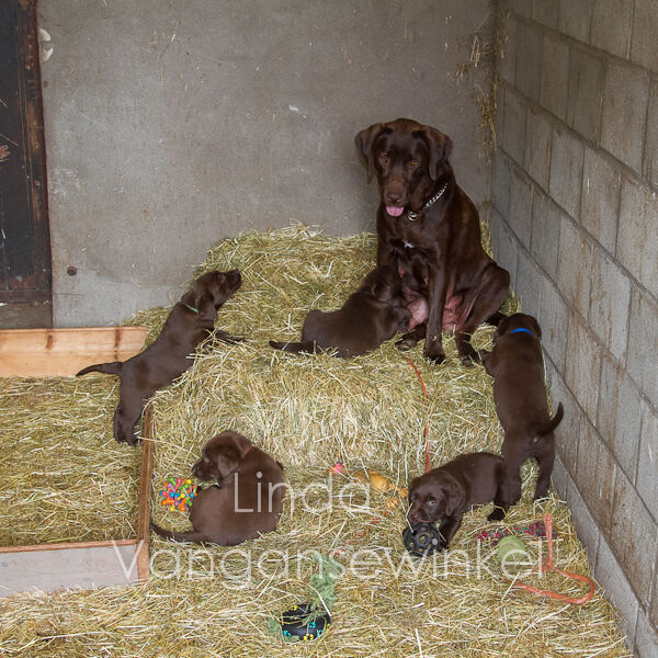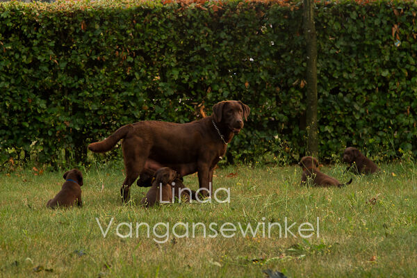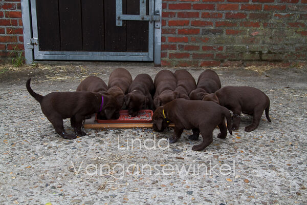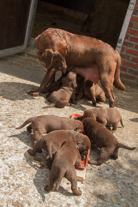 Deze week, met de huidige tropische temperaturen zijn we ook al eens het water in geweest met de kleine hupkes. Watergewenning, daar kan je nie vroeg genoeg mee beginnen. Zou toch eigen zijn aan labrador. Ook heb ik toch maar halsbandjes in verschillende kleuren gekocht. Het was echt nie te doen om ze uit mekaar te houden. NU KAN ER GEKOZEN WORDEN !!! Bij deze een oproep aan de eersten in rij om te kiezen, kom snel langs want de volgenden kunnen nie meer wachten ..... Daarna kan ik ook de laatste pup extra in the picture zetten.