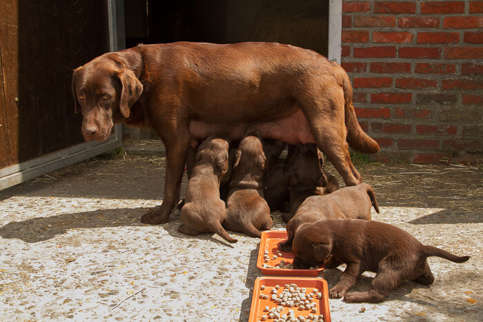 Sinds zaterdag begonnen met puppiebrokjes erbij te geven. En of ze dat lusten!!