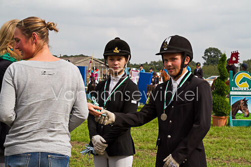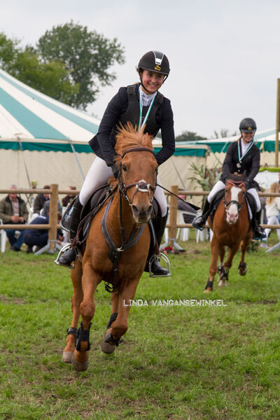 Mildrid Buteneers kon in dressuur een eerste plaats verzilveren (vergulden) met haar pony. En Pauline deed het super.