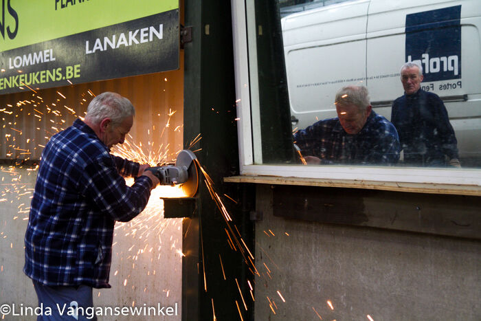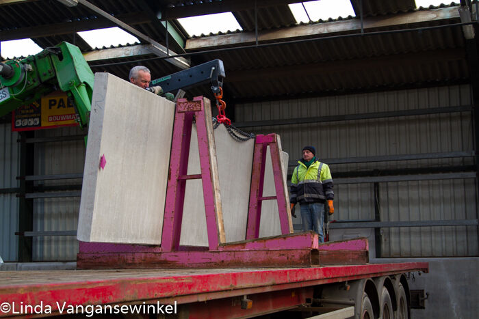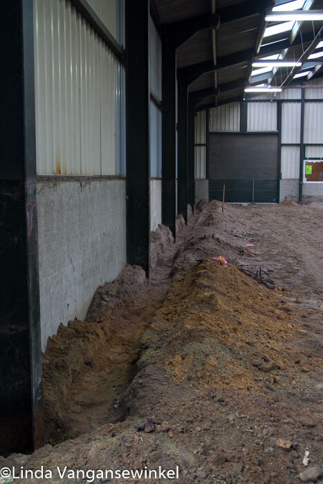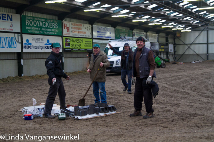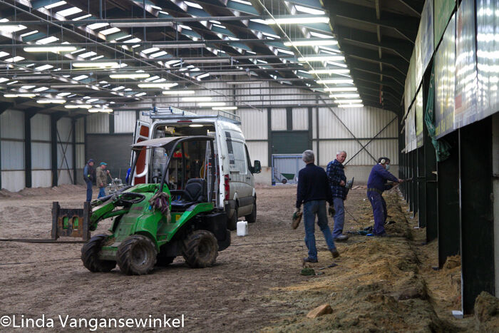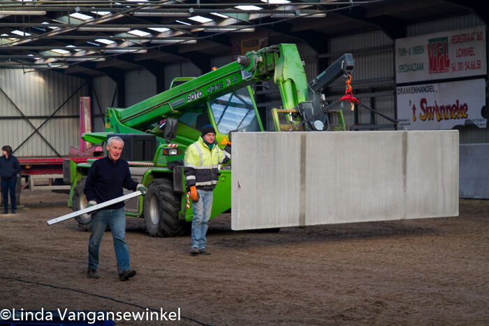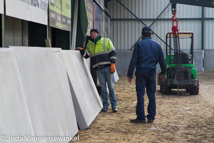 Ook in ons Noord-Limburgse Overpeltse rijhal wordt er naarstig gezwoegd. De houten zijwanden waren naar't schijnt aan vervanging toe. Dus werd er iets nieuws besteld, uit beton. Dat heeft wel tot gevolg dat je heel wat zwaarder (rollend) materieel nodig hebt om dit klaar te krijgen.