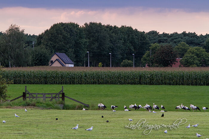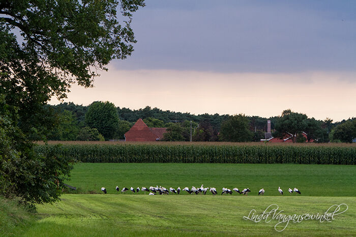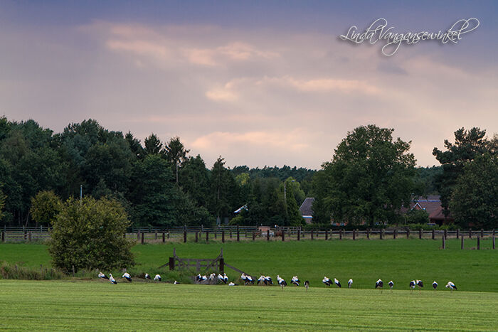 Gisteren tegen de avond komt Tei me roepen. Hier achter in de wei zitten 45 ooievaars, komt es rap met uwe kodak. Ik mijne fiets op, en inderdaad ne hele grote tros ooievaars zitten ginder ver. Ze verzamelen om morgen of toch heel binnekort de starten aan de grote trektocht. Voor echt ne deftige foto schiet mijn lens toch nog een heel stuk te kort. En dichterbij gaan doe ik toch maar beter niet. Ze moesten maar eens opschrikken, dan kreeg ik zeker en vast de orinitologen die een beetje verderop stonden gewapend met verrekijker achter me aan.