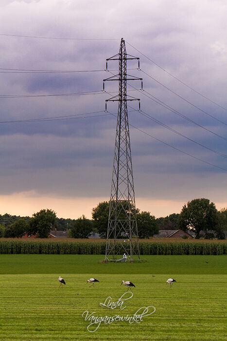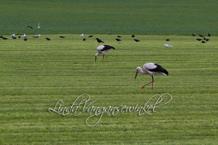 Komen daar twee wielertoeristen langs die het tafereel ook inne mot krijgen en wat snelheid minderen. Hoor ik de ene tegen de andere zeggen:"How, kiek doh es! Wa veel ooievaars. Da's nog gevohrlik, jong. Seffes hedde't zitten! Ge wit toch meh noejt met ooievaars" :)))