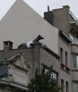 Omdat mijn gazettenvent (in het Antwerps) op verlof is moet ik alle dagen s morgens een wandeling doen om aan mijn favorieten krant GVA te geraken, zo vroeg in de morgen ziet de buurt er altijd anders uit rustigen dan kan men eens rondkijken, zo schrok ik wel even toen deze morgen een koe op een dak zag staan, ik dacht eerst dat ik nog niet goed wakker was, dat beest is natuurlijk namaak, maar ze staat er toch maar, zo zie je maar in mijn geliefde Seefhoek maak je dingen mee die je nergens anders ziet of vind. Zoals BV.een koe boven op het dak drie verdiepen hoog. Dat maakt het plezant om hier te blijven wonen, je ziet alle dagen wat anders, soms goeie dingen soms slechte dingen, maar er is hier wel leven in de bouwerij, zo zegt men in Antwerpen.