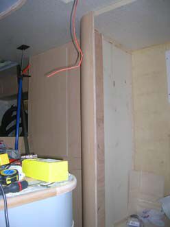 Dan de 'oude' hoek slopen, en de nieuwe plaatsen. Het uitzagen doe ik met een geweldig machientje, eigenlijk een schuurzooltje, maar met verwisselbare onderdelen, oa een segmentzaagje waarmee je perfect tot in de hoeken kunt komen, gewoon geweldig. De nieuwe hoek passen, vrij lastig want hij moet de precieze maat van de hoogte van de camper hebben, en krijg zo'n stuk maar eens binnen... Terug eruit om hier en daar nog iets af te frezen, en dan definitief op zijn plaats