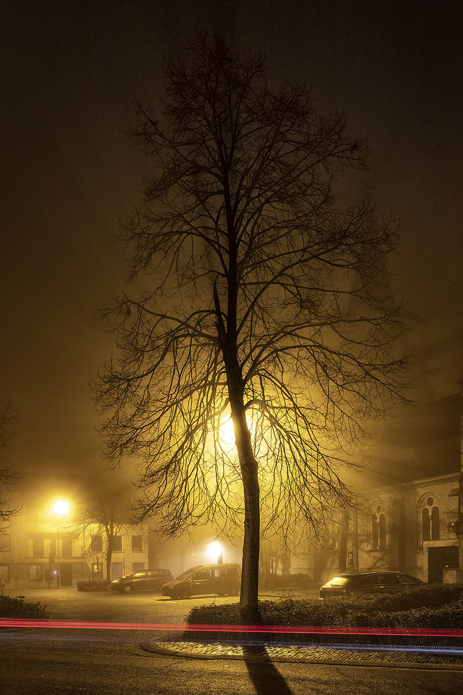 We hadden vanavond de eerste vergadering van het nieuwe werkjaar met de AV groep binnen de fotoclub, kwestie van al eens te bespreken wat de volgende projecten worden. Toen ik buitenkwam na afloop was de mist al redelijk dicht en ik bedacht zo maar dat ook 's nachts mistfoto's best het proberen waard zijn. Na even rondlopen vond ik aan de kerk een boom die ik in mooi tegenlicht te pakken kon krijgen. De vage kerk, huizen en geparkeerde auto's vond ik een sfeervolle achtergrond en toen er ook nog een wagen voorbij kwam rijden om voor die typische lange sluitertijd rode streep te zorgen was het beeld kompleet.