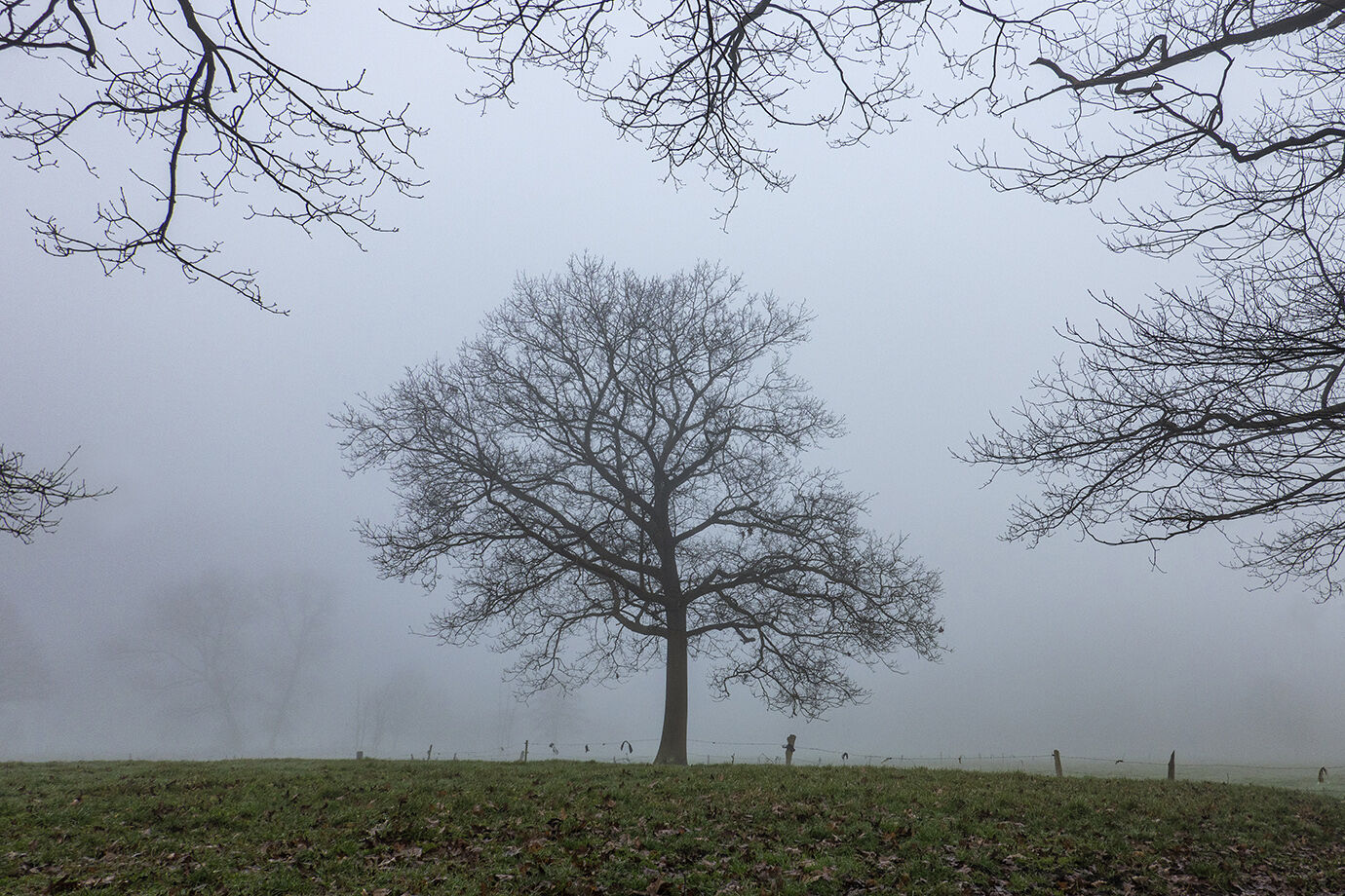 Tja, als ik dan voor één keer eens wat vroeger uit de bedstee wil komen om de mist, die ik gisteravond al in een foto kon inblikken, ook in het ochtendlicht te pakken te krijgen, bleek die toch niet zo spectaculair te zijn als ik had gehoopt. Het was een redelijk grijze ochtend met een geringe zichtbaarheid, dat wel, maar van mooie lagen of mistslierten eventueel met een doorbrekende zon of lichtharpen, daar was geen sprake van. Ik heb alsnog enkele aanvaardbare beelden op mijn kaartje gekregen maar indien ik het op voorhand geweten had was ik er zeker in blijven liggen. Of ik het morgenvroeg opnieuw probeer? ... Wie weet...
