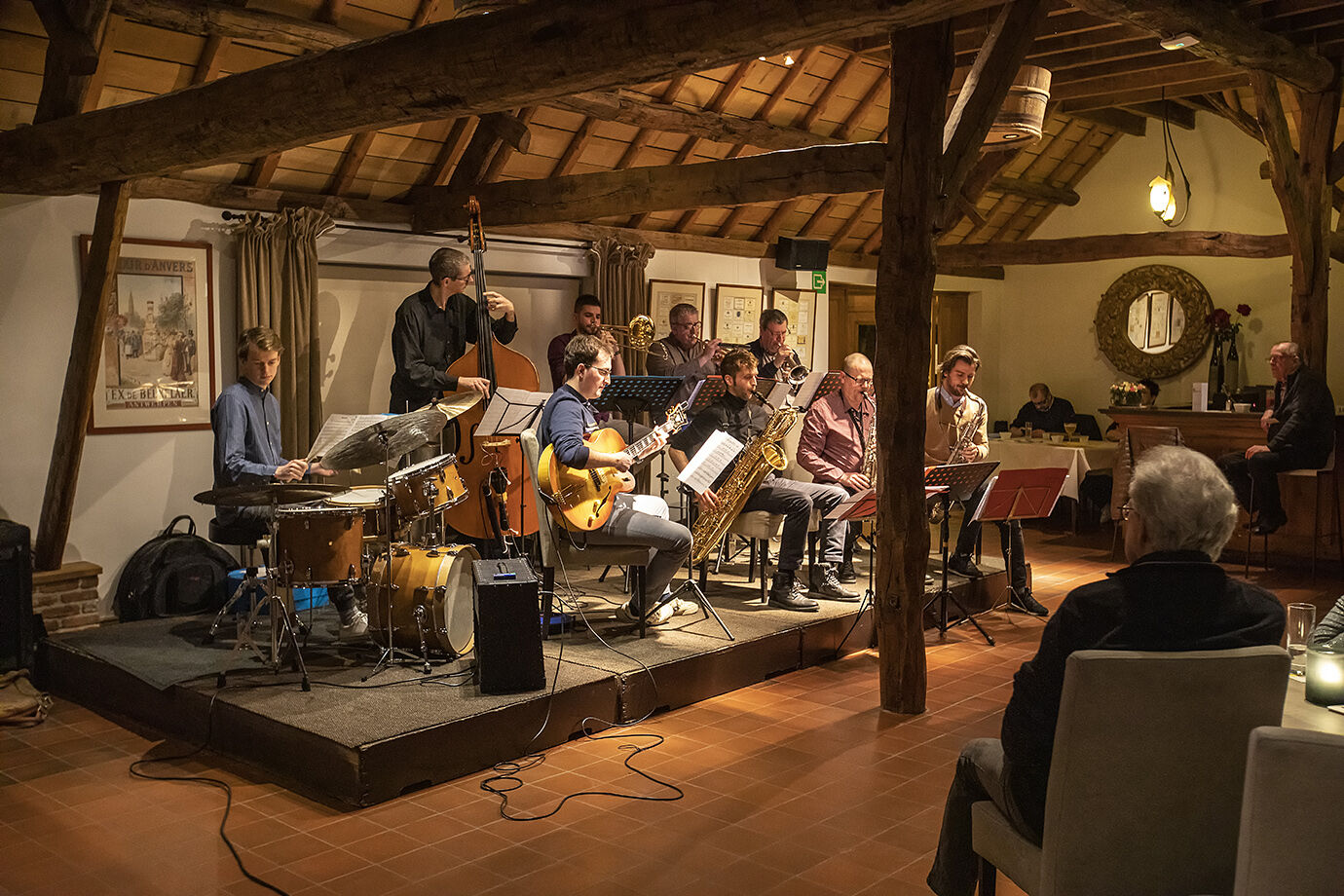 Een avond vol nostalgie is het geworden. Soms gebeuren dingen heel onverwacht en niet gepland. Je krijgt een bericht van een oude bekende, een ex collega... ik ga naar een evenement bij jou in de buurt. Dan hoor je dat een andere ex-collega met een ook al bekende vriend daar ook naar toe wil en... om een lang verhaal kort te maken: het werd een leuke reunie van muzikanten bij een optreden van de Jos Moons little big band in Jazz Club Houtum Street in Kasterlee. We hebben zeer genoten van de geboden muzikale hoogstandjes en uiteraard heb ik ook een en ander vastgelegd op mijn geheugenkaartje. Beelden van de vrolijke herinneringen-ophalers zal ik morgen wel op Facebook knallen, ondertussen is dit een opname van de little big band, een ongewone samenstelling toch... Flügelhorn, trompet, trombone, bariton-, tenor-, en altsax en een geweldige rhythm section, bas, gitaar en drums... een nonetet dus.