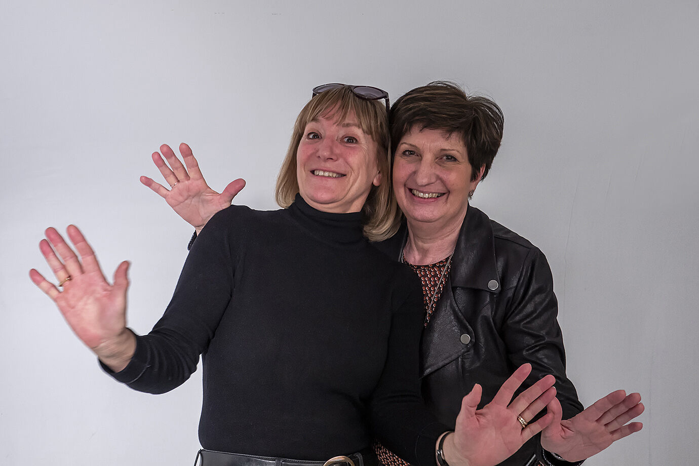We hadden vandaag een gezellig samenzijn gepland met mijn zus en haar Dreeke, mijn fotomentor, een gemeenschappelijke vriendin Myriam - ook uit ons geboortedorp Peer - plus haar Marcel en het vrouwke en ikzelf natuurlijk. Als je dan toch in het huis bent van een beroepsfotograaf is het zeer begrijpelijk dat je vroeg of laat ook wat gaat stoeien in de studio. Tussen alle professioneel geshoot door kon ik ook wat opnames maken uit de losse hand met mijn kleine Sonytje. Dit is mijn gekke zus met haar al even gekke vriendin Myriam.