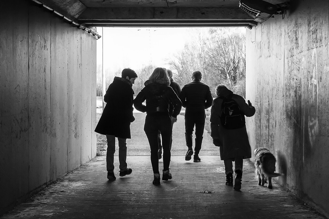 We hebben vandaag een poging gedaan om een geocache-rondje te gaan fietsen in de buurt van de abdij van Tongerlo maar al snel beslisten de weergoden er over dat we daar maar beter mee konden ophouden. De foto-oogst was dan ook navenant... zeer klein. Het feit dat ik vroeger dan gepland terug voor mijn PC zat gaf me dan weer de gelegenheid wat extra aandacht te besteden aan wat ik gisteren op mijn geheugenkaartje had gezet, en dat was heeeeel wat. Uit de wandeling die we van Langdorp langs de Demer naar Aarschot en terug maakten plukte ik dit beeld van mijn wandelkompanen tijdens de doorgang onder de grote weg doorheen het tunnelletje. Zulke silhouetten-foto vraagt er natuurlijk om dat je 'm in zwart wit omzet.