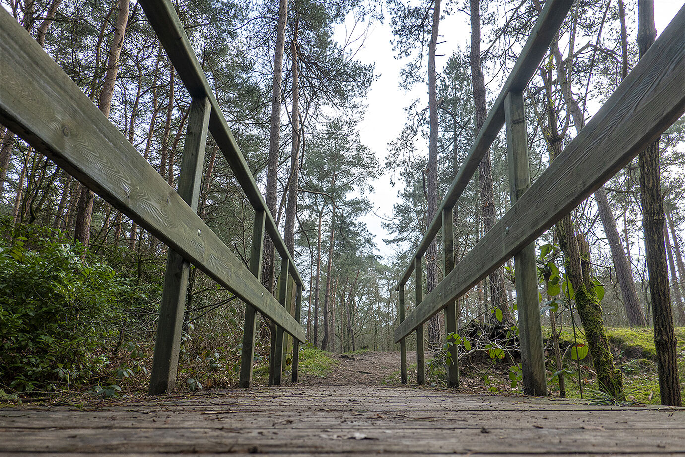 Na een totaal uitgeregende dag gisteren konden we vandaag gelukkig weer de wandeltoer op zonder zwemvliezen, regenpak of paraplu. In de loop van de namiddag ben ik met Phaido van een grote ronde Smallebroeken anex Ossengoor gaan genieten. Voor je dan een eind langs de Rulloop richting oostingang van de Hoge Rielen loopt moet je over het brugje. Daar heb ik een tijdje van uit diverse standpunten gefotografeerd. Kennissen en collega-fotografen weten wel dat ik nogal begaan ben met symmetrie en uiteraard wilde ik ook daar even mee aan de slag. Een laag standpunt - toestel op de grond en lichtjes naar boven gericht - leverde me dit beeld op. Ik heb het enkele keren moeten overdoen voor ik 'm goed genoeg vond, maar hier kan ik mee leven.