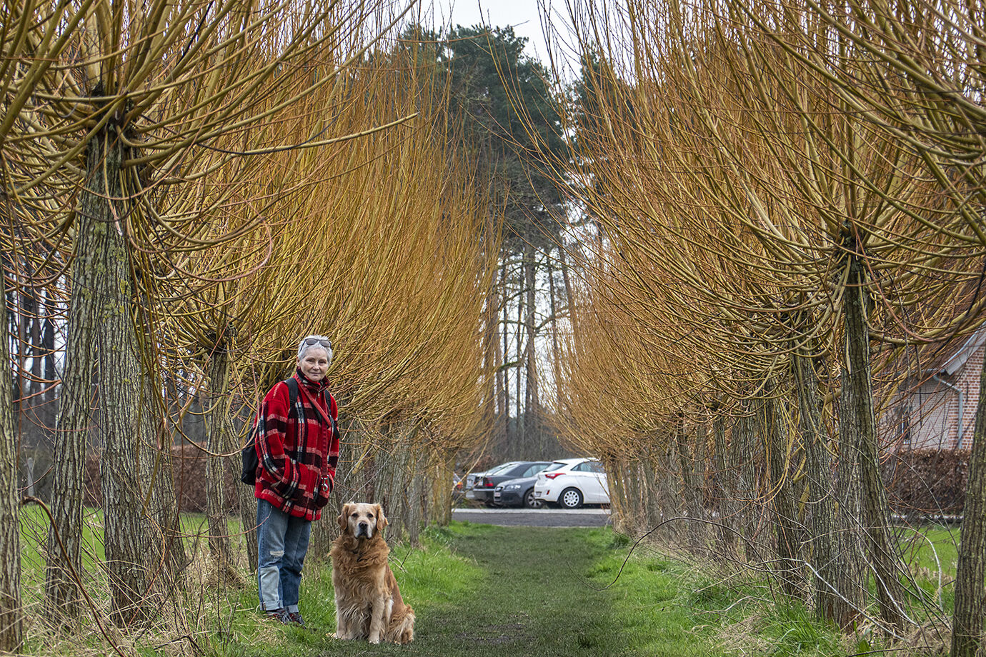We waren naar het fotosalon van Amfograf geweest in Itegem en op de terugweg wilden we even binnenwippen in het Prinsenhof bij Fé, een vriend van lang geleden. Het was er ouderwets gezellig, we hadden niet anders verwacht, en na enkele verfrissingen wilden we voor we verder naar huis reden nog een korte wandeling maken, om Phaido ook zijn pleziertje te gunnen. Wandelmogelijkheden zat daar en we kozen voor de wandelweg die achter de taverne richting bos gaat. Het werd een zeer korte wandeling evenwel want de ondergrond was echt veel te zompig voor het niet zo wandelgeschikt schoeisel dat wij aan onze voeten hadden. Toch heb ik mijn twee meest gefotografeerde modellen nog even in beeld genomen tussen de jonge wilgen.