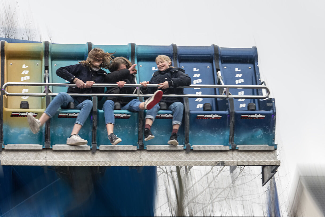 We waren vandaag te gast op het fotosalon van Arfoc in Arendonk. Terloops even vertellen dat dit echt een vette aanrader was. Dit salon valt telkenjare samen met de eerste kermis in de regio en de Garve, locatie van het gebeuren, ligt aan de rand van het kermisterrein. Het was niet meteen kermisweer vandaag, maar de fotografiekriebels waren bij het buitenkomen uit de zaal extra gemotiveerd. Ik volgde onder andere deze drie jongedames toen ze een ritje in de Lambada maakten. Meetrekken is een techniek die we gebruiken bij fietsers en autoraces bvb maar in vertikale cirkels meetrekken viel toch echt niet mee... Ik heb veeeel keer geschoten om enkele aanvaardbare foto's over te houden. Dit is niet meteen de scherpste uit de reeks maar ik vind 'm wel de leukste. Scherpte hoeft niet altijd het alles beslissende criterium te zijn toch?