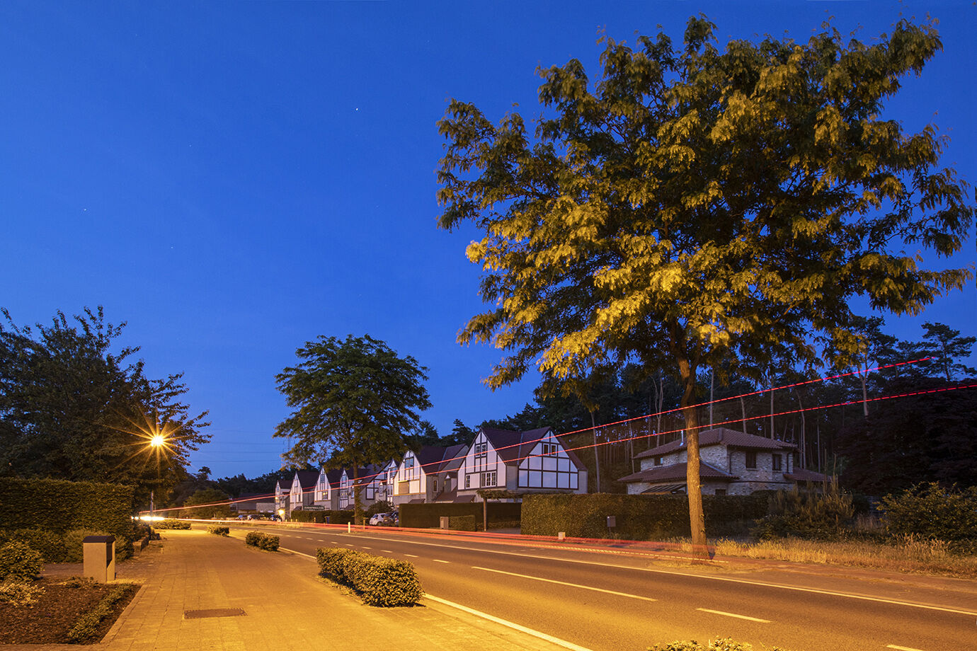 Een mooie Pinksteravond, kwart voor elf. Ik ben met mijn camera en statief nog eens aan de wandel gegaan, deze keer niet richting dorp maar voor één keer eens richting Kasterlee. Net in de bocht heb ik het statief neergeplant, de camera in stelling gebracht en de combinatie huizen, boom, straatverlichting en voorbijrijdende vrachtwagen in één beeld gevat... en natuurlijk het blauwe uurtje, gewoon omdat ik het leuk vind.