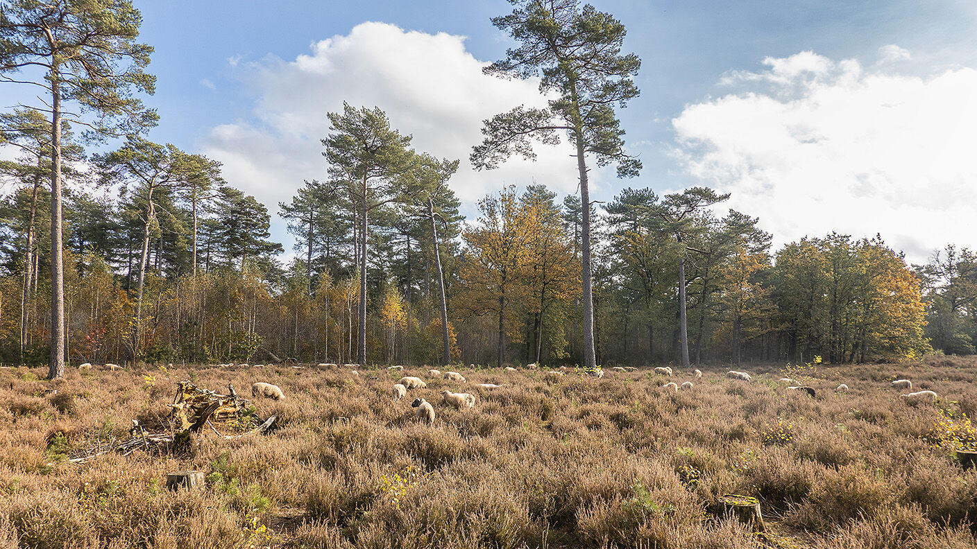 Dat alles was misschien wél een trigger om mij er toe te overhalen even de fiets aan de kant te zetten en een eindje te lopen om op de in ere herstelde heide langs de Goorse weg deze kudde te fotograferen toen ik daar samen met het vrouwke langs gefietst kwam vandaag. Zoals ik gisteren al even stelde, ook hier komt de herfst weer om de hoek loeren.