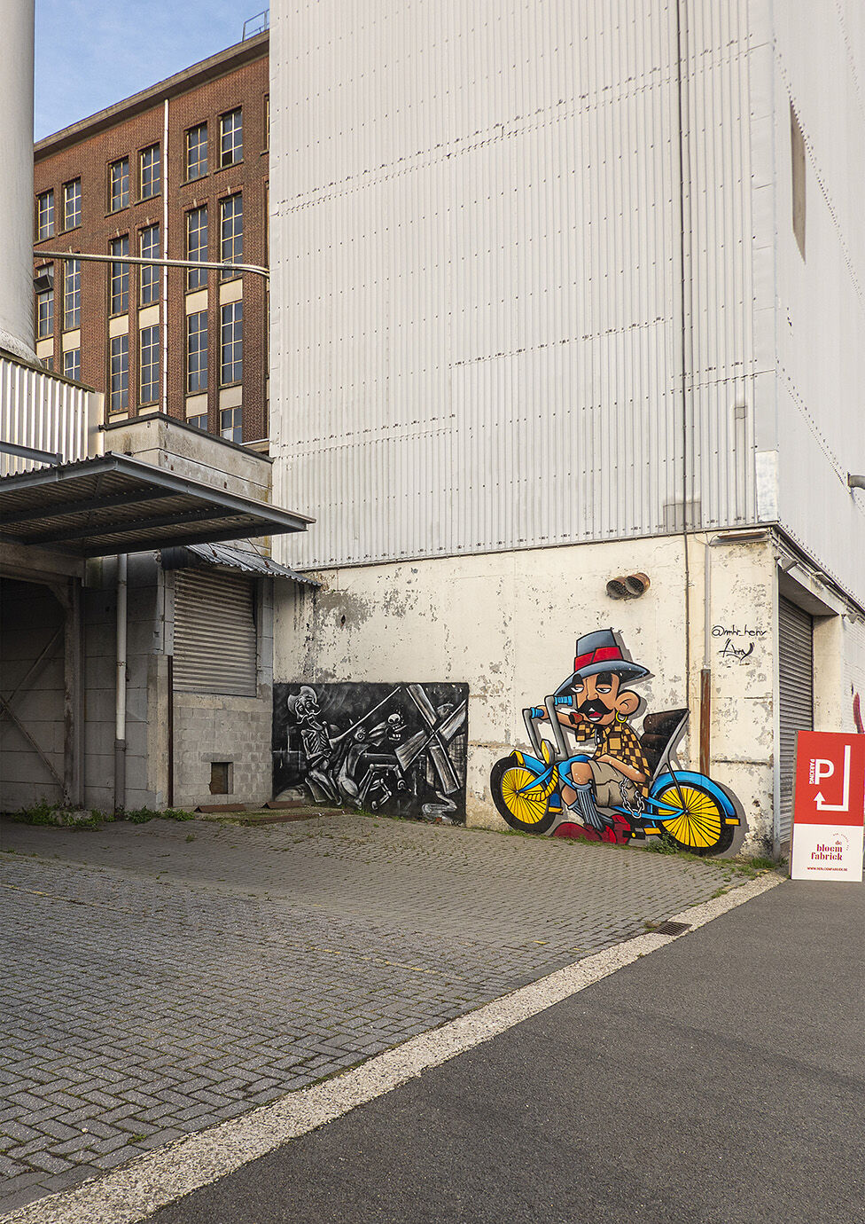 Toen in de Geelse bloemmolens langs het Kempisch Kanaal in Ten Aard een aantal jaren geleden alle activiteiten werden stilgelegd zag het er naar uit dat weer een iconisch stuk industriële archeologie zou verdwijnen. Ondertussen zijn er toch interessante reanimatiepogingen gaande. Tegenwoordig is er een hippe horecazaak gevestigd, een welgekomen aanleghaven voor de vele er voorbij komende fietsers. De Bloemfabriek is de nieuwe naam en ik ben er ook al enkele keren gaan checken of ze er toevallig geen Duvelke verkopen. De mooie graffiti op een van de zijgevels waren me al eerder opgevallen en voor ik me even neer vleide op het terras om iets te consumeren heb ik mijn altijd parate Sonytje er enkele keren op gericht. Ik durf beweren dat dit echt kunst is, hier is een artiest aan het werk geweest die niet zomaar wat op een muur kliedert. De gekleurde rechter tekening bvb lijkt door de toevoeging van schaduw los te komen van de muur en een zekere mate van Picasso-gehalte van de zwart wit tekening links is zeker ook wel aanwezig.
