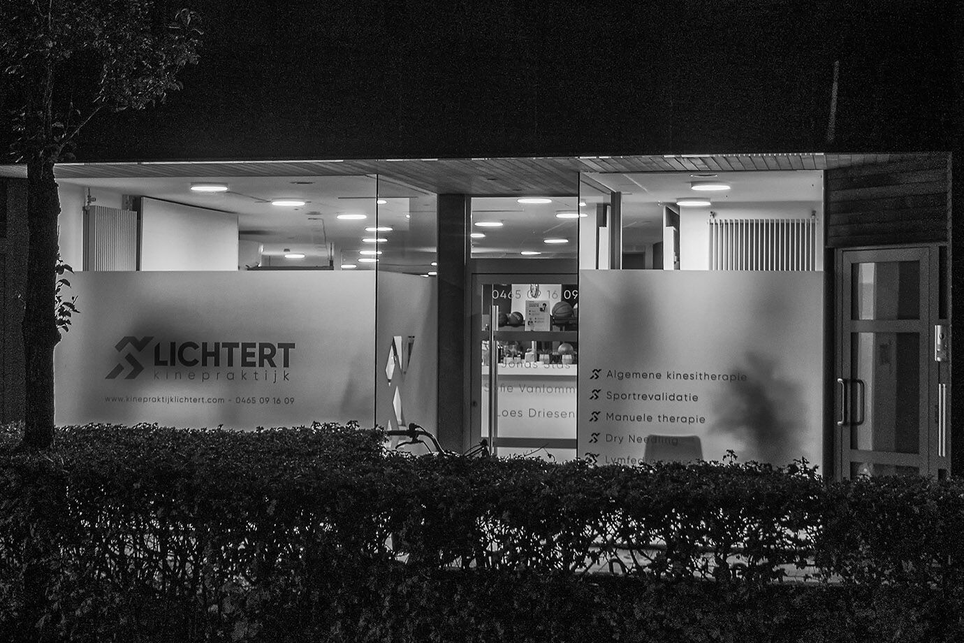 Na een heerlijke maaltijd, te voet onderweg van de Italiaan naar huis, en dan zie je dit verlichte pand waar je terecht kan voor kine en andere weldoende behandelingen. Ik maakte meteen de link naar de Audio-Visuele reeks over ons dorp (Lichtaart) die ik dit weekend ga tonen op het fotosalon van onze club Visueel. Een beetje extra reclame is nooit weg en een foto daarbij ook niet. Ik had geen statief bij en ook de Canon was thuis gebleven maar zoals altijd kwam de kleine Sony weer uit mijn zak piepen. Uit de hand, op de automaat-stand, en ik geef het toe, er zit wel wat ruis in de opname, maar ik vond het wel een leuk plaatje.