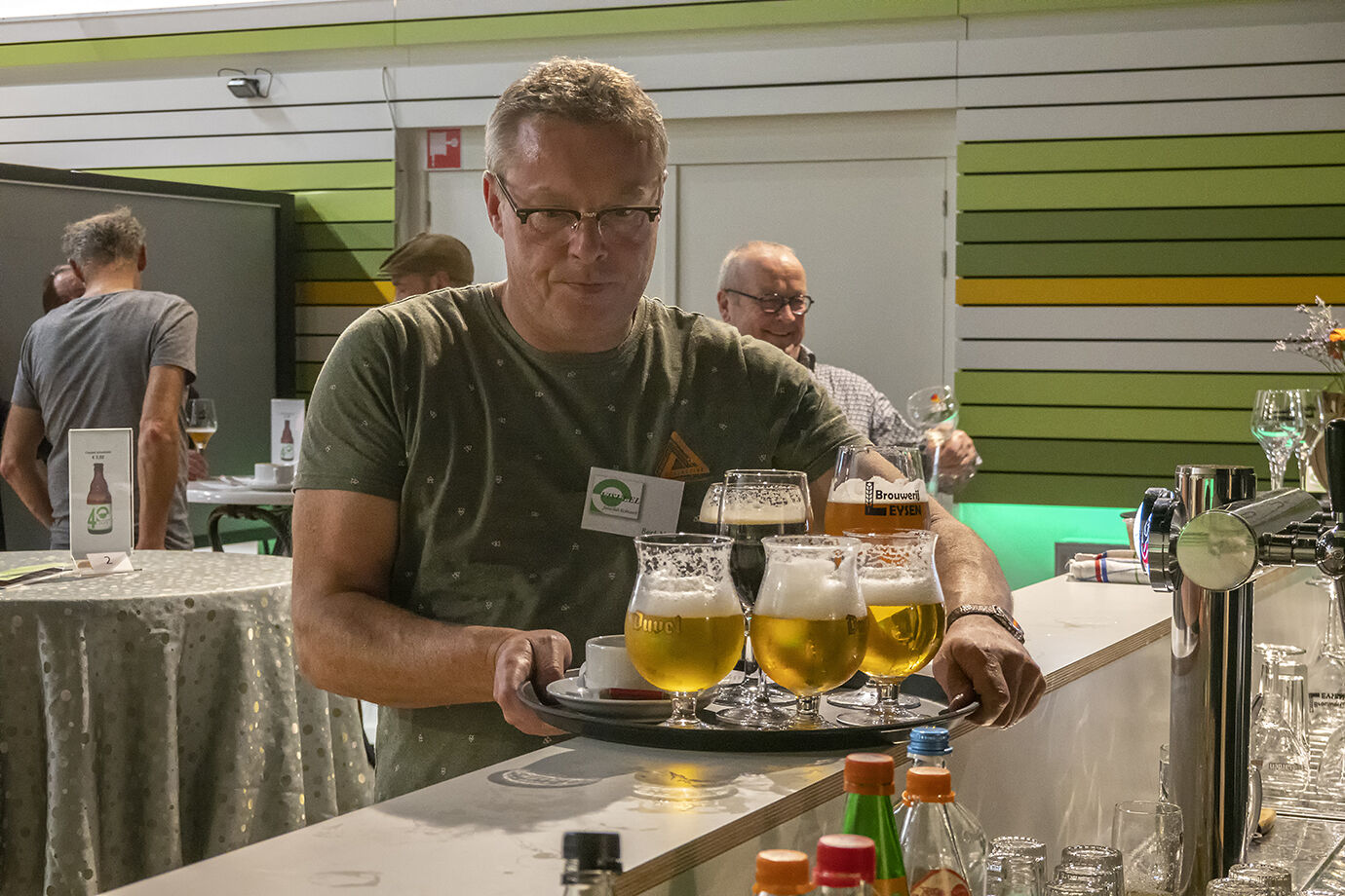 We hebben allemaal flink ons best gedaan om onze beste werken te selecteren en te tonen, maar ook op het salon zelf zijn er veel taken te vervullen, we hadden dan ook een schema opgemaakt waarbij iedereen een aantal tijdsblokken moest invullen met een activiteit. Zo stond ik vandaag enkele uren achter de toog om ervoor te zorgen dat de dranken keurig in de glazen en zo via de in de zaal oberende andere clubleden bij de dorstige bezoekers belandden. Gelukkig waren er ook nog enkele spaarzame momenten waarop ik de kleine Sony kon bovenhalen om de activiteiten rondom mij vast te leggen. Bert gaat de vers ingegoten heerlijkheden naar de klanten brengen. Er zijn bij die klanten zoals je ziet mensen met een goede smaak.