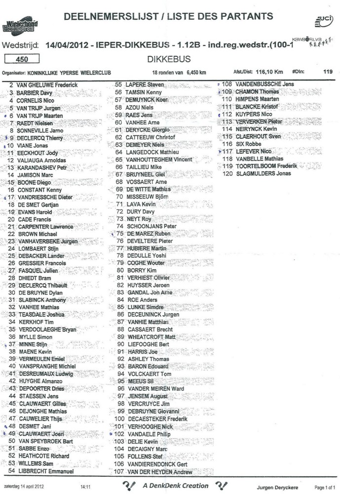Er waren 120 renners aan de start verschenen voor 18 ronden van 6.5 km oftewel 117 km in lijn. Nog voor de start gegeven werd moest Bart Van Speybroek de wedstrijd staken met een breuk aan zijn versnellingsapparaat. Al van in de eerste ronde werd er op het gaspedaal geduwd zodat het peleton al in zeven stukken brak. In de derde ronde kwam een groep van vijftien man voorop. Na zes ronden moesten twee koplopers ploegmaats Kim Borry en Joeri Clauwaert (Cycling Team Soenens-Construct Glas) lossen. Samen kwamen ze met drie achtervolgers Jonas Viaene (Ovyta-Eijssen-Acrog Cycling Team),Jani Desmet(Douchy Thalassa Cycling Team Oostende/Langemark) en Sil Meeus (Provincie Afdeling West-Vlaanderen Wbv) terug bij de dertien koplopers. De wind zou de spelbreker in de koers worden. Op 7 ronden van het einde viel Sil Meeus met een lekke band voorin weg. Op 5 ronden van het einde vielen nog eens 7 renners voorin weg met name Wheatcroft Matt (Counties Manukau),Kuypers Nico (Cycling Team Soenens-Construct Glas),Lefever Nico (Sportvrienden Dries Wielsbeke),Van Trijp Maarten (Lotto Belisol U23),Viaene Jonas (Ovyta-Eijssen-Acrog Cycling Team),Verdoolaeghe Bryan (Ksv Deerlijk-Gaverzicht-Matexi) en Desmet Jani (Douchy-Thalassa Cycling Team Oostende/Langemark). In de finale vielen nog eens twee renners uit de kopgroep weg met name Ruben De Marez (Wielerteam Decock-Sportivo Moorsele) en Clauwaert Joeri (Cycling Team Soenens-Construkt Glas). Met nog twee ronden te gaan bleven vooraan nog 9 renners over Chamon Thomas (Fuji Test Team),Minne Stijn (Ct.Keukens Buysse Knesselare),Maene Kevin (Cycling Team Helsmoortel Lutho),Vandriessche Dieter (Ksv Deerlijk-Gaverzicht-Matexi),Borry Kim (Cycling Team Soenens-Construkt Glas),Nielsen Raedt (Douchy-Thalassa Cycling Team Oostende/Langemark),de ploegmakkers Vandenbussche Jens en Depoorter Dries (Ovyta-Eijssen-Acrog Cycling Team) en Thierry Declercq (Wielerteam Decock-Sportivo Moorsele) die zouden strijden voor de bloemen. De elf leiders gingen samen de slotronde in en de kopgroep verbrokkelde. Uiteindelijk sprintten vier renners Minne Stijn,Vandenbussche Jens,Vandriessche Dieter en Depoorter Dries voor de zege. Jens Vandenbussche haalde het vlot,maar voor de tweede plaats was het nipt tussen Stijn Minne en Dries Depoorter 3e,Dieter Vandriessche werd 4e. Bij de achtervolgers won Kevin Maene de spurt voor de 5e plaats voor Raedt Nielsen 6e,Declercq Thierry 7e,Chamon Thomas 8e en Borry Kim 9e. Enkele tellen later werd De Marez Ruben 10e voor Clauwaert Joeri 11e. De Peletonsspurt voor de 12e plaats werd gewonnen door Van Trijp Maarten voor Desmet Jani 13e,Lefever Nico 14e en Viaene Jonas 15e. Van de 120 gestarte renners kwamen er 116 over de meet.
