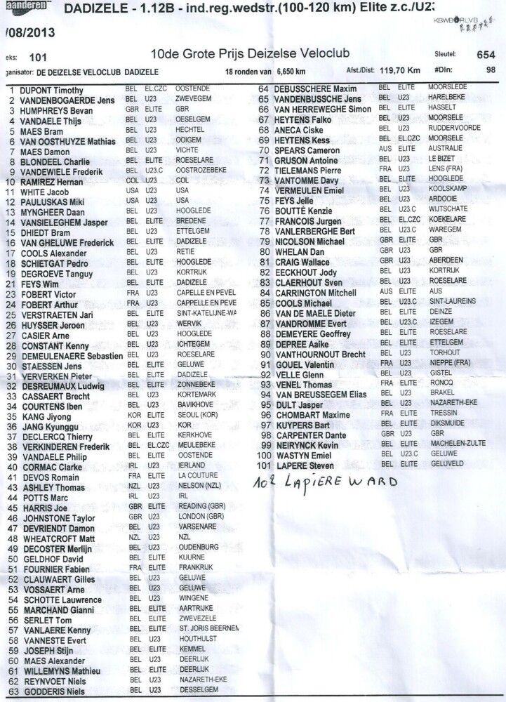 Er waren 99 renners aan de start verschenen voor 18 ronden van 6,650km oftewel 119,70km in lijn. Van bij de start stoven de coureurs weg zodat na bijna een halve ronde enkele renners (tien) al de valiezen mochten pakken en naar huis gaan einde wedstrijd. In de derde ronde kwamen vijf renners op kop met name Glenn Velle (Douchy-Thalassa Cycling Team Oostende/Langemark),Daan Myngheer (Efc-Omega Pharma-Quick.Step) ,de ploegmakkers Vanlerberghe Bert en Belgisch Kampioen Timothy Dupont (Ventilair-Steria) en Bram Dhiedt ( Team Deschuytter-Kwsc-Westkerke). De vijf koplopers werkten goed samen zodat hun voorsprong in de vijfde ronde op liep naar de minuut. In het peleton deden Wastijn Emiel en Vandewiele Frederik (Ventilair-Steria) goed afstoppingswerk voor hun ploegmakkers in de kopgroep. In de zesde ronde moest Bram Dhiedt (Ettelgem) de kopgroep laten gaan wegens een lekke achtertube, Halfkoers was het verschil bijna twee minuten op het eerste deel van het peleton. In het peleton moest Stijn Joseph (Ovyta-Eijssen-Acrog Cycling Team) de wedstrijd verlaten met een klapband. Het werd nog spannend toen bij het ingaan van de slot ronde zeven renners met name de ploegmakkers Vandewiele Frederik en Wastyn Emiel (Ventilair-Steria),de ploegmakkers Verkinderen Frederik en Heytens Kess (Team 3M),Tielemans Pierre (Ec Raismes Petite Foret Porte Du Hainaut),Geldhof David (Wielerteam Decock-Woningbouw Vandekerckhove) en Decoster Merlijn (Vl Technics-Abutriek Cycling Team) tot op een kleine vijftien seconden naderden. De vier kopmannen spurtten toch voor de overwinning, Er stond geen maat op Timothy Dupont (Oostende). Hij behaalde al zijn zestiende overwinning dit seizoen. Door de klassementenspurten won hij ook een fietskader. Ploegmakker Bert Vanlerberghe werd tweede voor Daan Mynheer 3e en Glenn Velle 4e. Bij de achtervolgers won Kess Heytens de spurt voor de vijfde stek voor Vandewiele Frederik 6e,Verkinderen Frederik 7e,Tielemans Pierre 8e,Wastyn Emiel 9e,Geldhof David 10e en Decoster Merlijn 11e. Op bijna twee minuten en half won Reynvoet Niels de peletonsspurt voor de twaalfde plaats voor Vanlaere Kenny 13e,Francois Jurgen 14e,Gouel Valentin 15e,Marchand Gianni 16e en Vandenbogaerde Jens 17e. Van de 99 gestarte renners kwamen er 65 over de meet. De gemiddelde snelheid van de renners was 42,750km/u.
