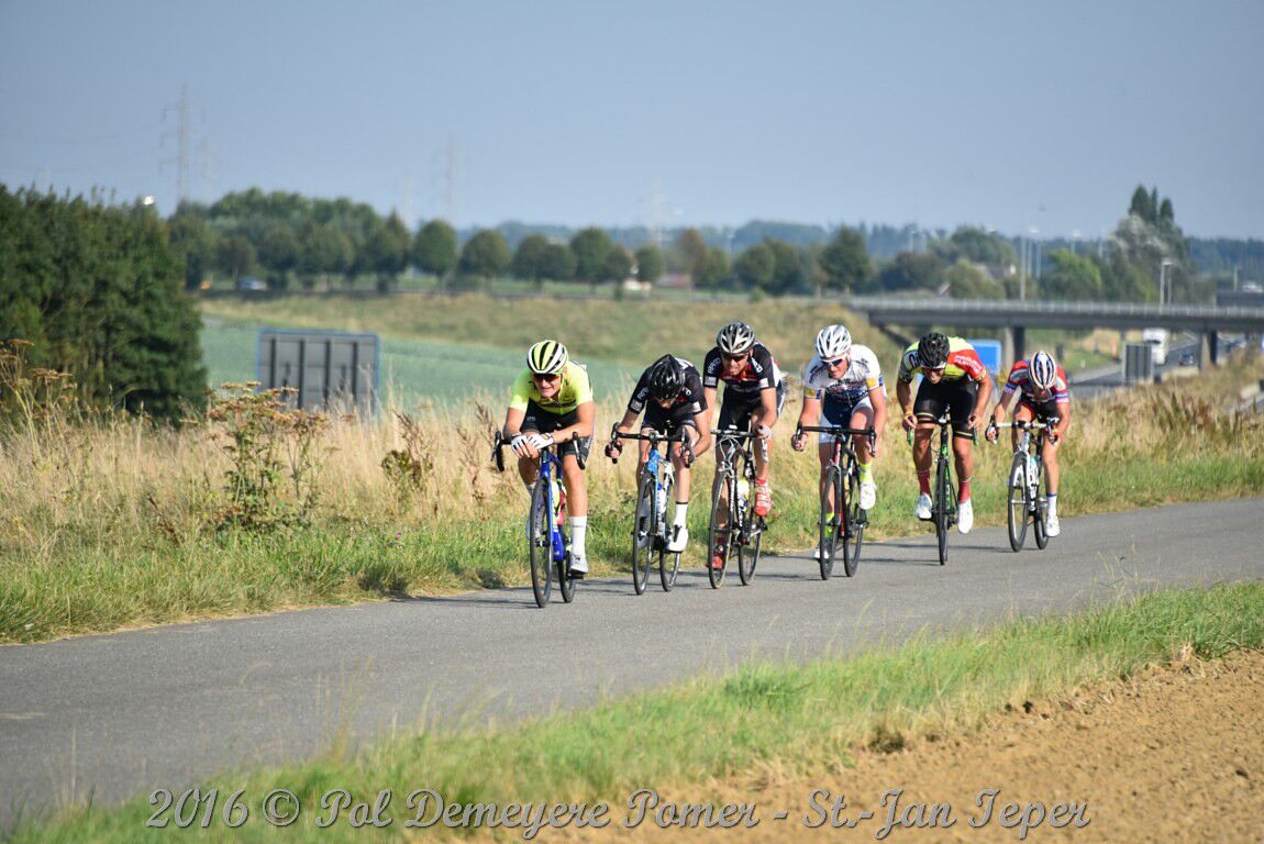 Drie ronden later sloten zeven man aan met name Michael Jonckheere (Smartfoto Cycling Team),Arne Casier (Pct Tomacc),Kim Borry (Dovy Keukens-Fcc),Jordy Vanmeenen (Home Solution-Anmapa-Soenens Cycling Team),Niels Demeyer (Ct Ivt-Ruwomat-Alnowakken),de Zwitser Johan Jacobs (Marlux Napoleon Games) en de Braziliaan Nicolas Sessler (Vl Technics-Experza-Abutriek Ct).