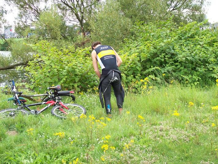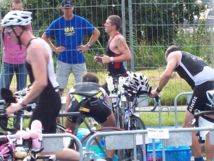 We waren heel vroeg. Nog weinig volk - deelnemers te bespeuren, maar het kwam toch op gang. Vooraleer het ingaan van de zone wordt zowel de helm als de fiets gecontroleerd. Alles klopte als een bus, en ik mocht me naar mijn 1/2e nadar begeven. Daar legde ik zorgvuldig alles klaar zodat niks zou mislopen bij mijn wissel. Ik deed er alles heel rustig, zodanig rustig dat het op de heupen woog van de meegereisde clan. Ondertussen waren Mario, Heidi en Jara er ook al bij. Olivier, Maud, Ringo, Franky, Isabelle, Toontje, Yves, Philippe, Erwin, Milo en Adoline waren er, toen ik uit het water kwam, ook al bijgekomen. Veel volk voor een middenmotor...