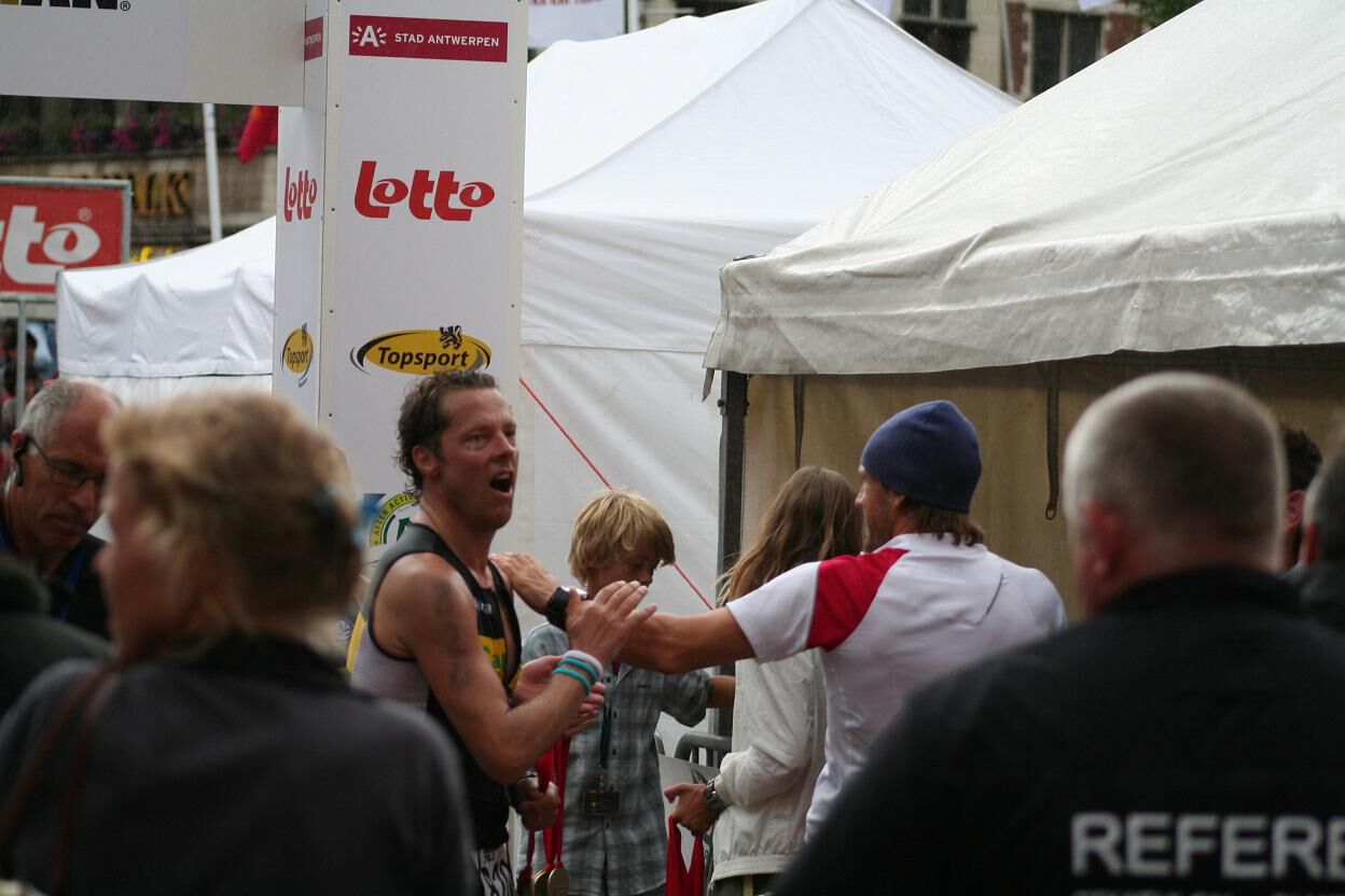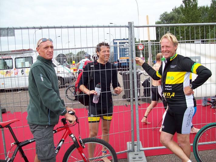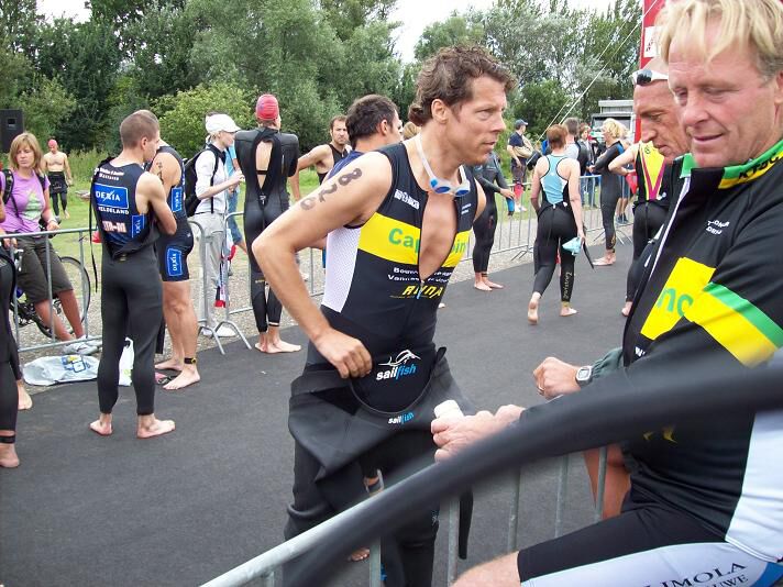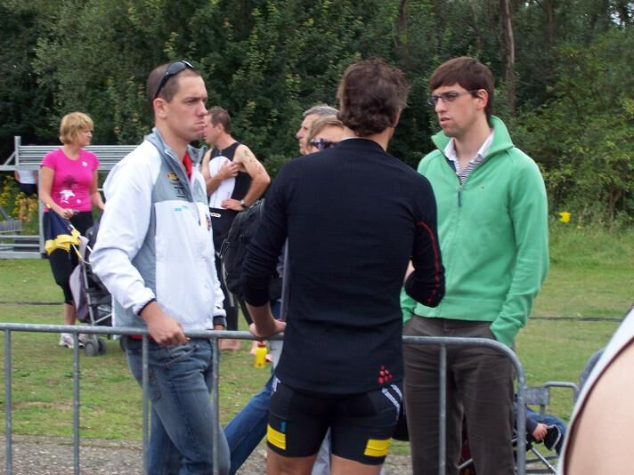 Vooraleer het zwemmen maakte ik nog een praatje met Frederik en Vincent Van Lierde. De eerste werd verleden jaar nog Europees kampioen op de halve afstand, werd dit jaar in Nieuw Zeeland tweede in zijn eerste volledige Ironman... Er is dus hoop voor Groot Menen voor de toekomst. Ook Rutger Beke passeerde naast mij, en geniet eerder een strenge blik. Niettemin kon er toch makkelijk een goeie dag af. Dat zal de concentratie wezen. Zoals ik eerder zei, super sympa's die toppers !!!