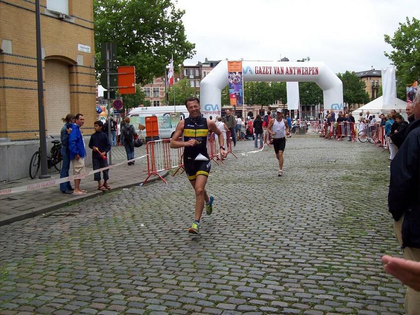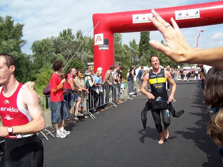 Toen was het bijna elf uur en dit betekende Swimming time. Om vijf voor moesten we snel het water in en wrong me door de massa naar voor. Ik had me voorgenomen om 5u30 als max te finishen, dus wou ik ca na 35 min uit het water zijn. Na 31 min was ik al uit de plas en had ik nochtans de indruk niet zo best gezwommen te hebben. Aangename Surprise.... T'was een strijd van je welste in het water. Een wip langshier, de stamp langsdaar... sommigen weten gewoon niet waar ze zwemmen. Ga je naar links om een lastigaard te ontwijken, dan gaan ze mee, ga je naar rechts idem dito. Gewoon om in je stroom te kunnen volgen. Op een bepaald moment hangde er een constant aan mijn voeten, waardoor ik bijna nie meer vooruit ging, en was ik genoodzaakt eens mijn voeten goed los te slaan. Ik deed mijn straalmotor aanslaan, maar god strafte me onmiddelijk met een kramp die nog voelbaar is in mijn rechterkuit. Het duurde wel een minuut vooraleer deze verdween, maar het was bijna op het einde. Zal een schoon zicht geweest zijn tijdens die zwemminuut... Uit het water vangde ik een glimp op van teammate Romano, en wist me te vertellen dat we amper 31 min. wedstrijd hadden, en ik was enorm trots. Zodanig trots dat ik bijna mijn pak niet openkreeg. Uiteindelijk moest ik het al wandelend doen, en eens open zag ik mijn talrijk opgekomen vrienden in de verte met olé olé gebaren me aan te moedigen. Eerste serieuze kippenvelmoment. De wissel verliep uitzonderlijk TRAAG. Had ik me een beetje geforceerd in het water of niet?? ik deed het vooral naar de mening vn mijn meute te rustig. Gelijk hadden ze wel, maar alles sloeg tegen in de wisselzone. Ik kon geen keuze maken van het mee te nemen materiaal, bleef babbelen met Oli, net alsof ik een terrasje aan het doen was, maar uiteindelijk na een kleine 6 minuten besloot ik toch te vertrekken. Ik had de 900e tijd met mijn wissel, en er haalden me er 175 terug in... Jammer... Een wijze les voor de toekomst. Eens op de velo was alles van mij weg aan het gaan, en moest ik gewoon het hoofd koel houden. Heenrichting meestal rugwind, retour felle tegenwind met snijdende regenvlagen. Opletten voor onvlakke plaatsen, putjes, e.d. Ik was aarzelend, maar niettemin goed vertrokken. Lage rugpijn kwam in me op net voor halfweg. Fiets staat geen 100% juist. Regen en gladheid gaan vaak samen, net als wind en stayern. Ik deed het niet, maar volgens Eric "de vriend van Ellen" werd er nogal wat gestayerd. De gladheid deed me heel wat trager ons bochtenwerk doen, en op een bepaalde strook mocht er van de politie uit persoonlijke veiligheid niet meer gefietst worden. Vet of olie aan de sporen waren de oorzaak. Al wie reed viel onverbiddelijk op zijn taart, en zelfs al wandelend hadden we niet veel meer over. Ik maakte daar twee keer gebruik van om de onderrug eens los te manipuleren. Door die stops (nog ééntje om mijn potje met materiaal op te rapen) verloor ik een achttal min. Ik arriveerde na 2u47 min, met een gemiddelde van 32,5 km/U en dat was niet slecht naar mijn norm. Als je met die 8 min - regel rekening houdt, dan had ik toch een constante van 34 gemiddeld. En daar is zeker nog wat progressie !! En uiteindelijk was ik aan de wissel. Toen zag ik Toontje staan. IK kreeg er de krop van in de keel. Sjiek gebaar van een gentleman ! De wissel was heel goed. IN een dikke minuut weer vertrokken voor de hunt for Eric. Die was me reeds in de wisselzone voorbij gelopen van zwemmen naar fietsen, en zijn fietsen is normaliter sterker dan mijn kunnen. Het loopnummer kon dit nog dichten. Ik was er immers een 20 min later aan begonnen. Ik ben E. voorbij gelopen en nooit gezien. Soms herken je elkander niet meer. Mijn wissel verliep een stuk vlotter. IK had de 69e tijd op 1100 deelnemers. Ik begon er aan als een vuurpijl aangemoedigd door mijn legioen. Maar besefte al snel dat ik dit tempo niet ging volgen. Ik kwam snel aan een tempo van 12,5 km/U, en hield dit ook aan. Een moeilijke toer met veel draaien en keren, trottoir op en af...kassei - gladde meir, etc.... De finish naderde meter per meter en was meer dan de moeite waard. Ik arriveerde vlak in het zicht van mijn maten, en stonden luidkeels te roepen. Ik deed een vreugdesprong die bijna het horloge van de organisatie in de vernieling deed gaan , zakte wat sober ineen, liet me emotioneel effe gaan, en zocht mijn supp's op. Ook kreeg ik nog eens schouderklopje van een ware klassebak mee, den Marc H. himself, en dat doet altijd deugd. Het begon wel enorm te gieten zeker!!! Maar dit belette ons niet samen gezellig een ferme pot te gaan pakken. Vervolgens was het de terugweg, na het afhalen van het eigen materiaal. Eindtijd 5U08M50S. Een dik uur beter dan vorig jaar, en het kan nog beter.... Nu zijn we in verlofstemming en zullen er dubbel en dik van genieten. Dank aan alle meegereisde Supp's, maar heel speciaal aan Mel om me de nodige steun en geduld te bieden.